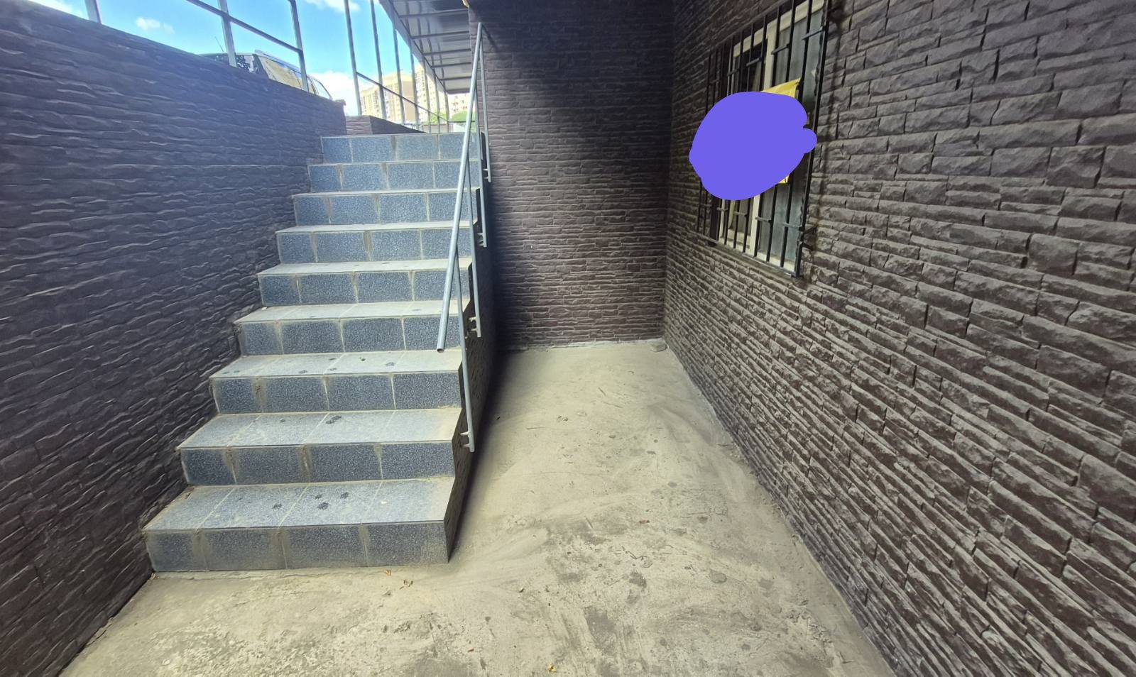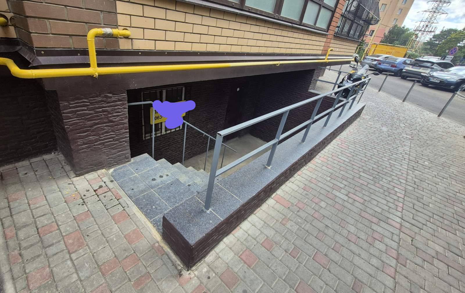 Фасад помещения облицован декоративной плиткой, очень удобная лестница.