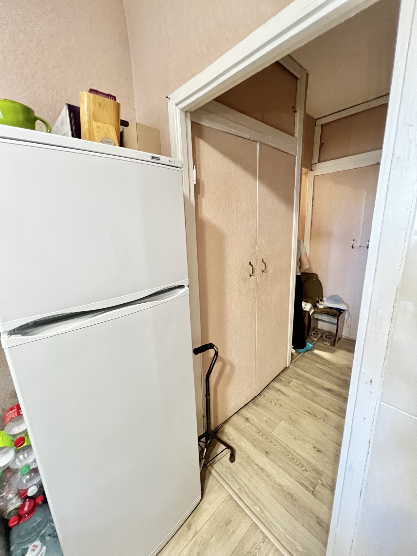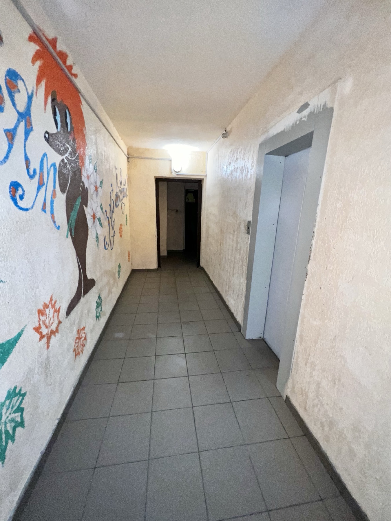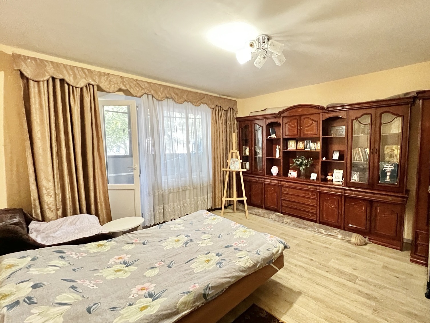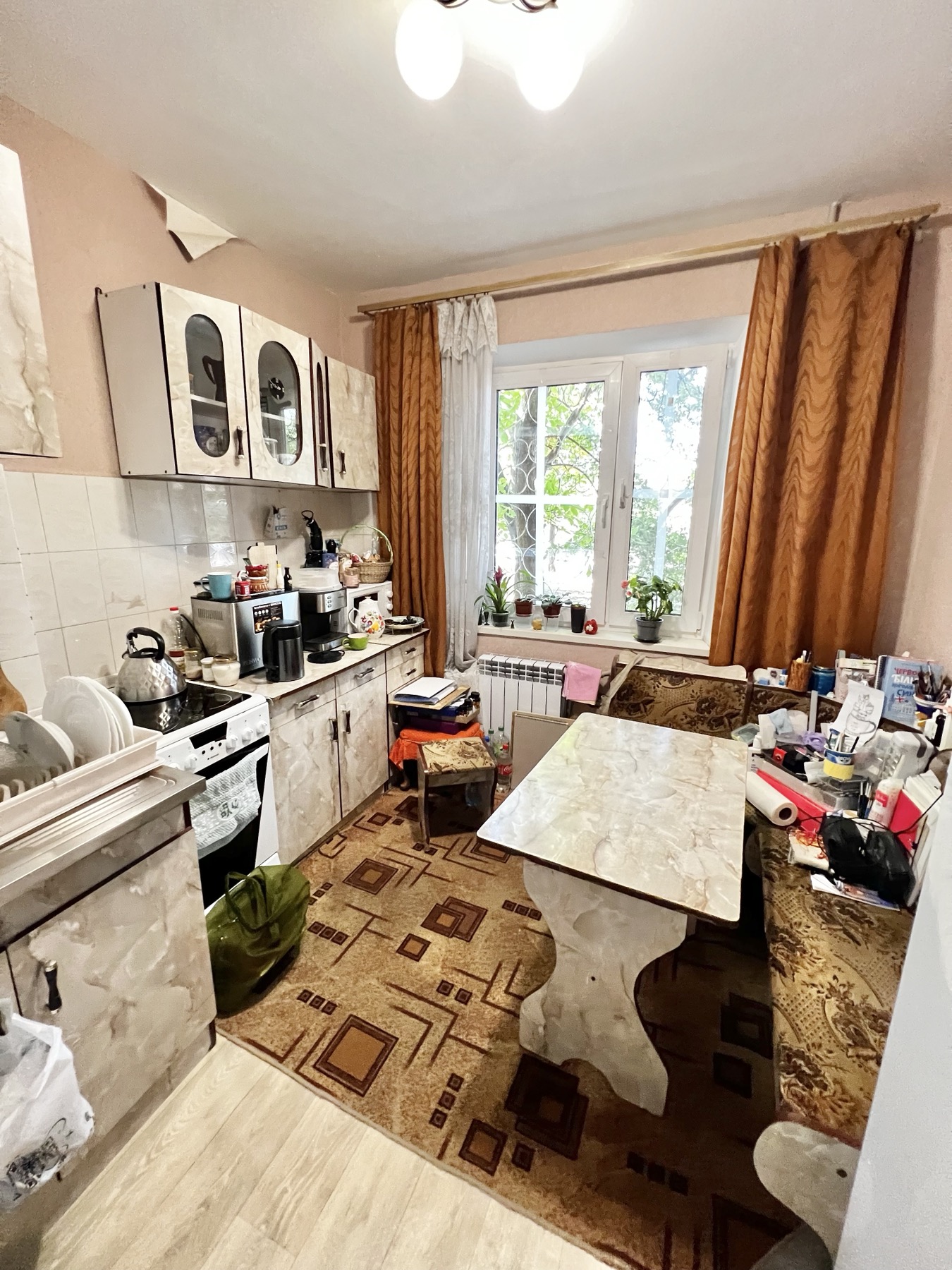 1/12 эт., балкон застеклён, три окна и балконная дверь выходят в зелёную зону на фасадную сторону дома.