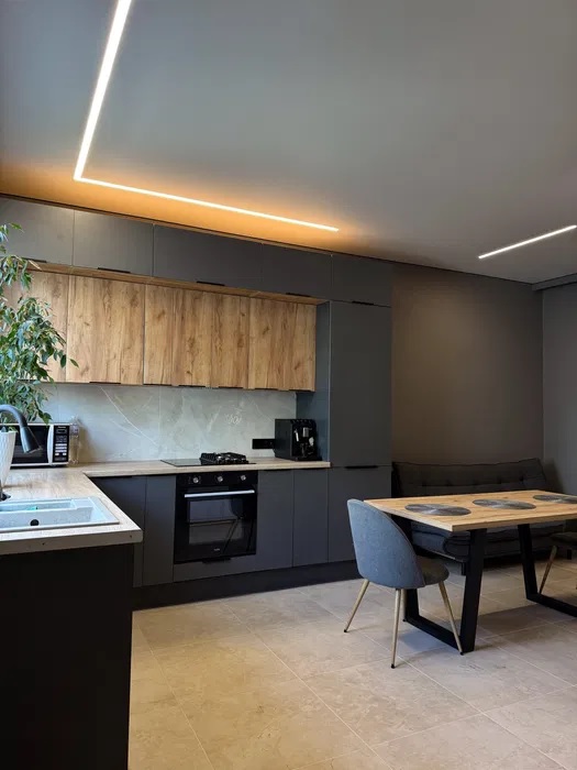 На кухне установлены: встроенная посудомоечная машина, встроенный холодильник, духовой шкаф и варочная поверхность (газ+электричество)