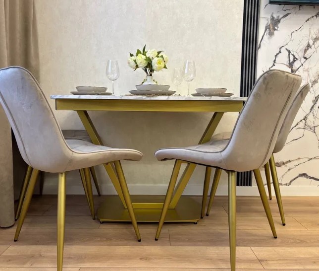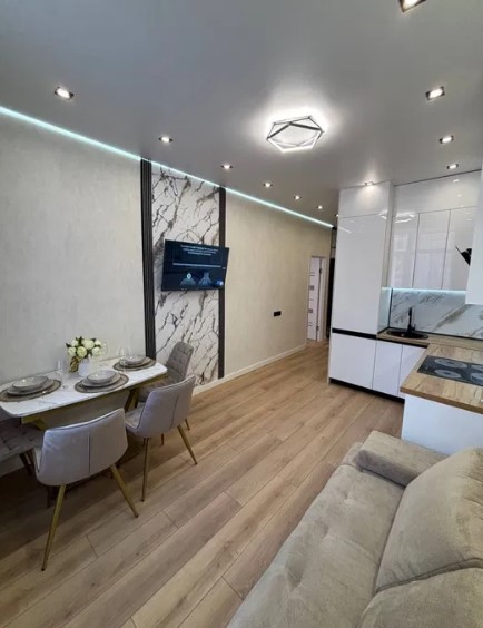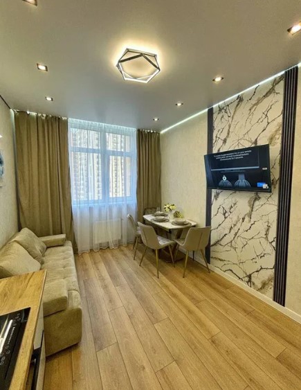 Кухня-гостиная с полной комплектацией -стильный раскладной диван, стол со стульями на золотых ножках. Мраморная столешница. Уютная спальня в светлых тонах, гардеробная и выход на большую террасу.