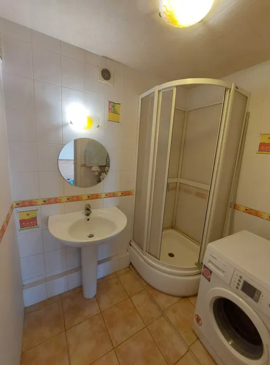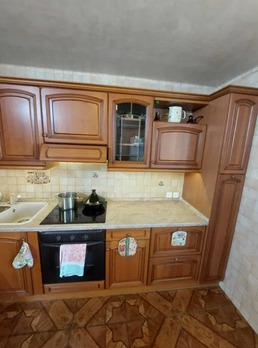 Установлена очень удобная итальянская кухня со всей необходимой техникой — вытяжка, посудомойка, духовка, новая варочная поверхность. Площадь кухни 12 м2.
