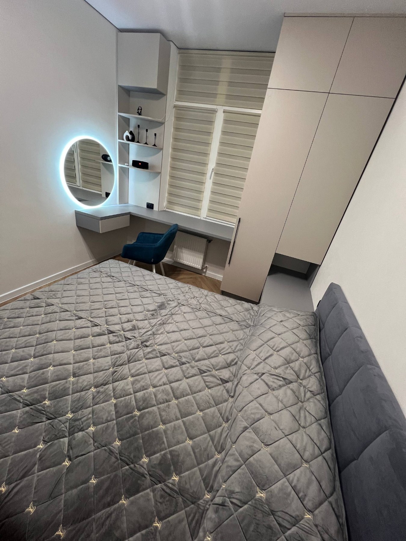 Рационально поделили площадь , полноценная спальня с большой кроватью , прикроватные тумбочки , вместительный шкаф , стол для работы , места для хранения, парящая полочка с зеркалом .