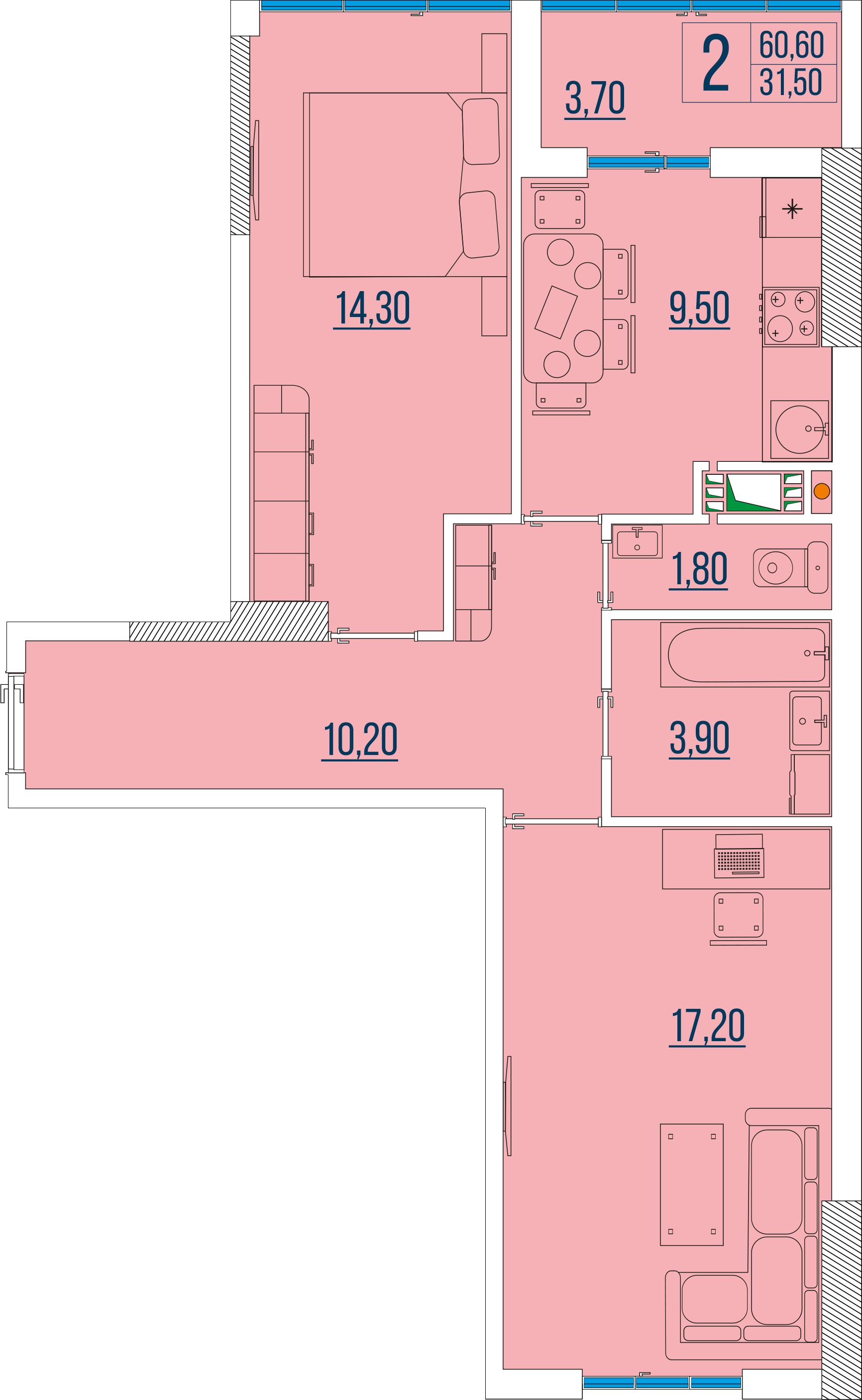 Двухкомнатная 60,5 кв.м., рассрочка, в ЖК Бульвар Акаций