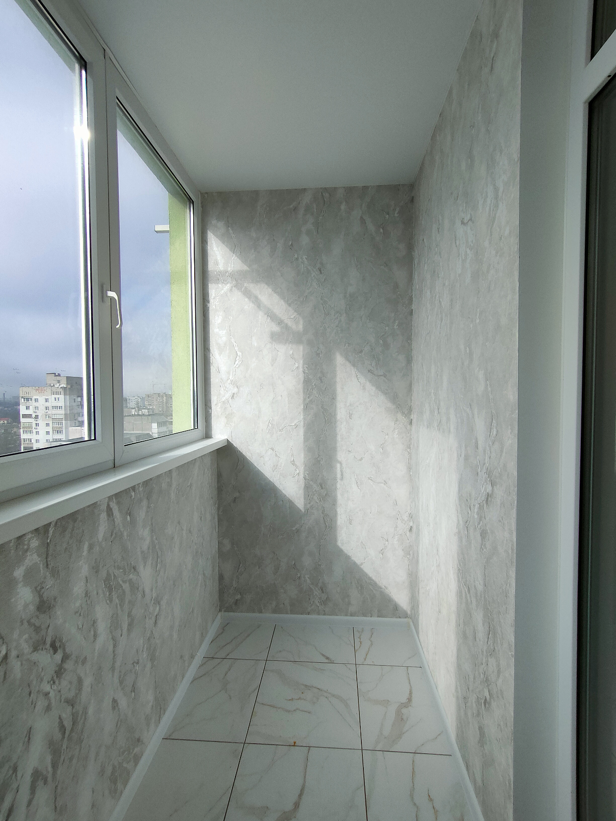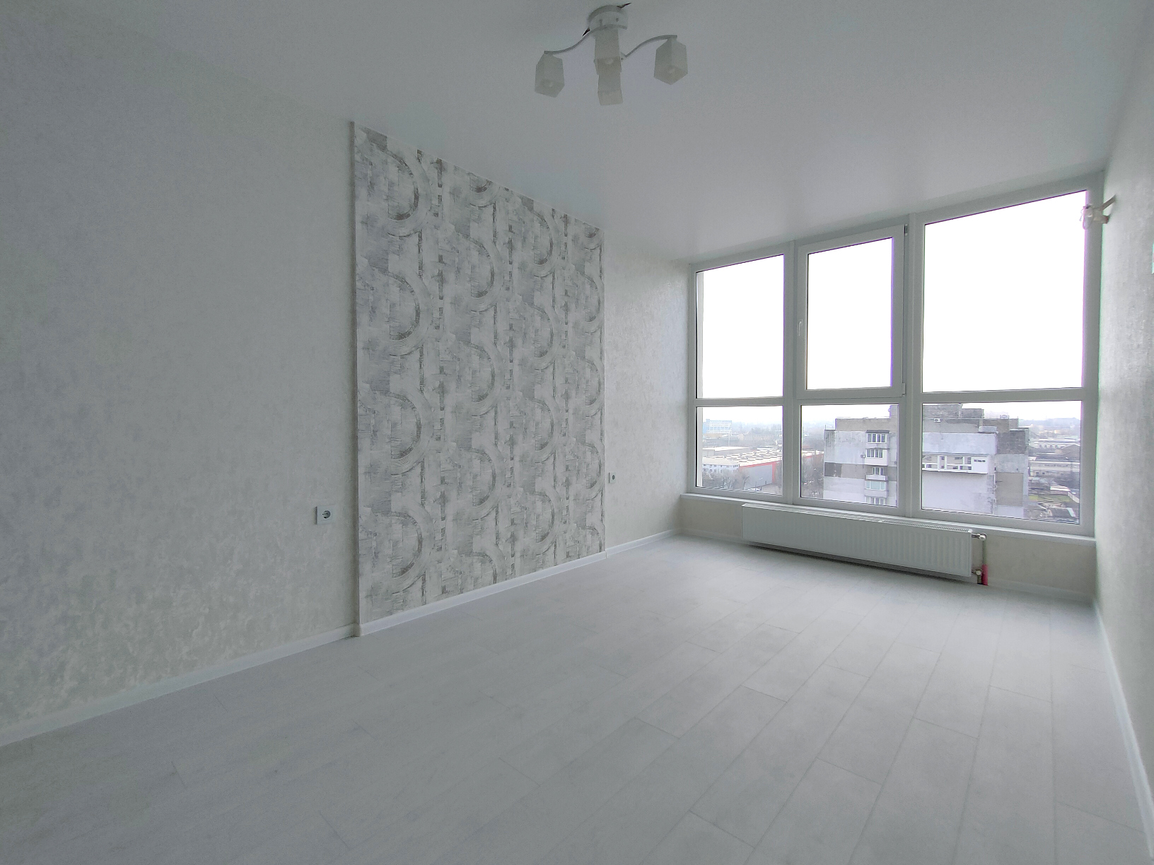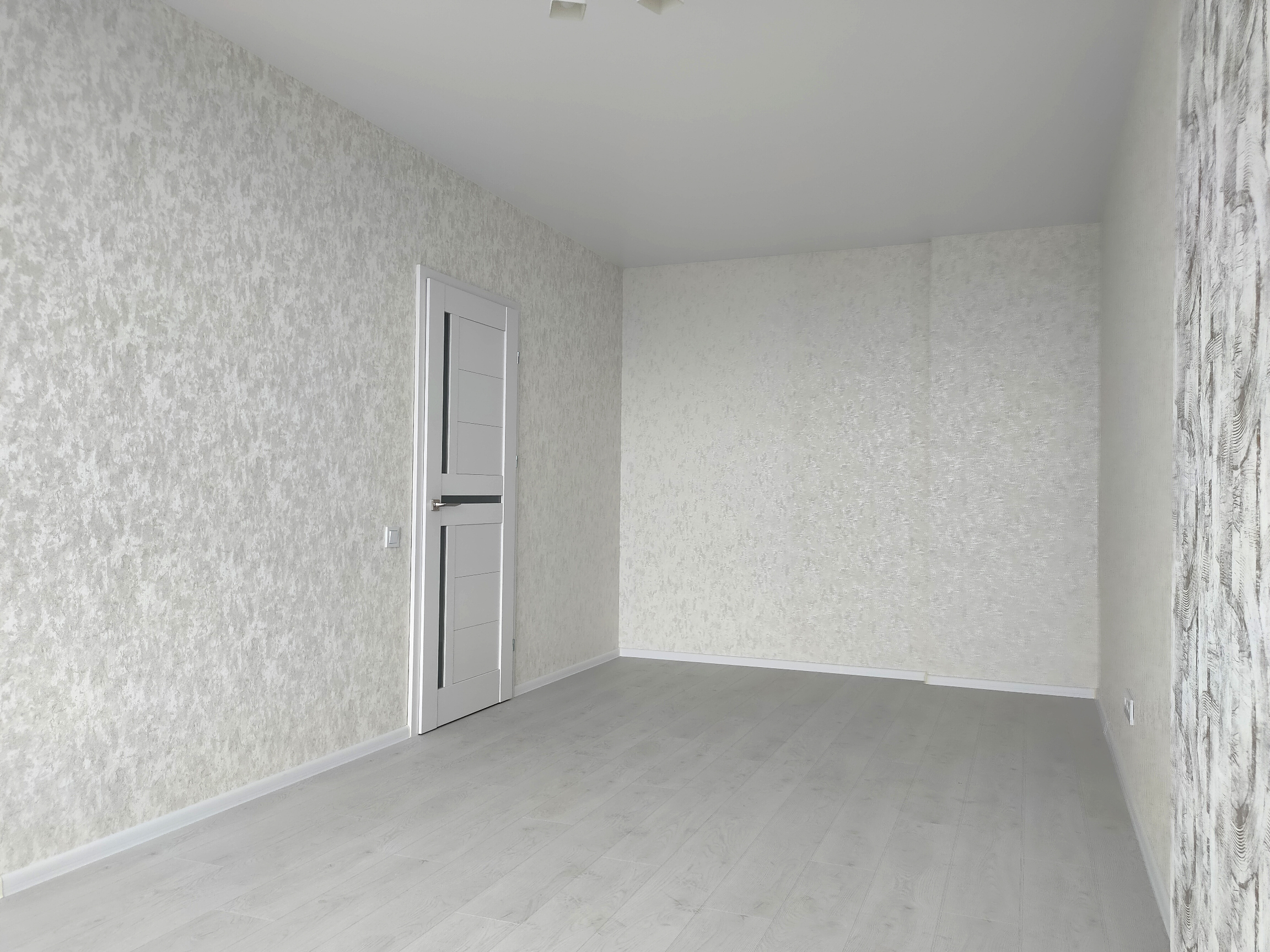 Стены-обои, пол ламинат и плитка, потолок натяжной.