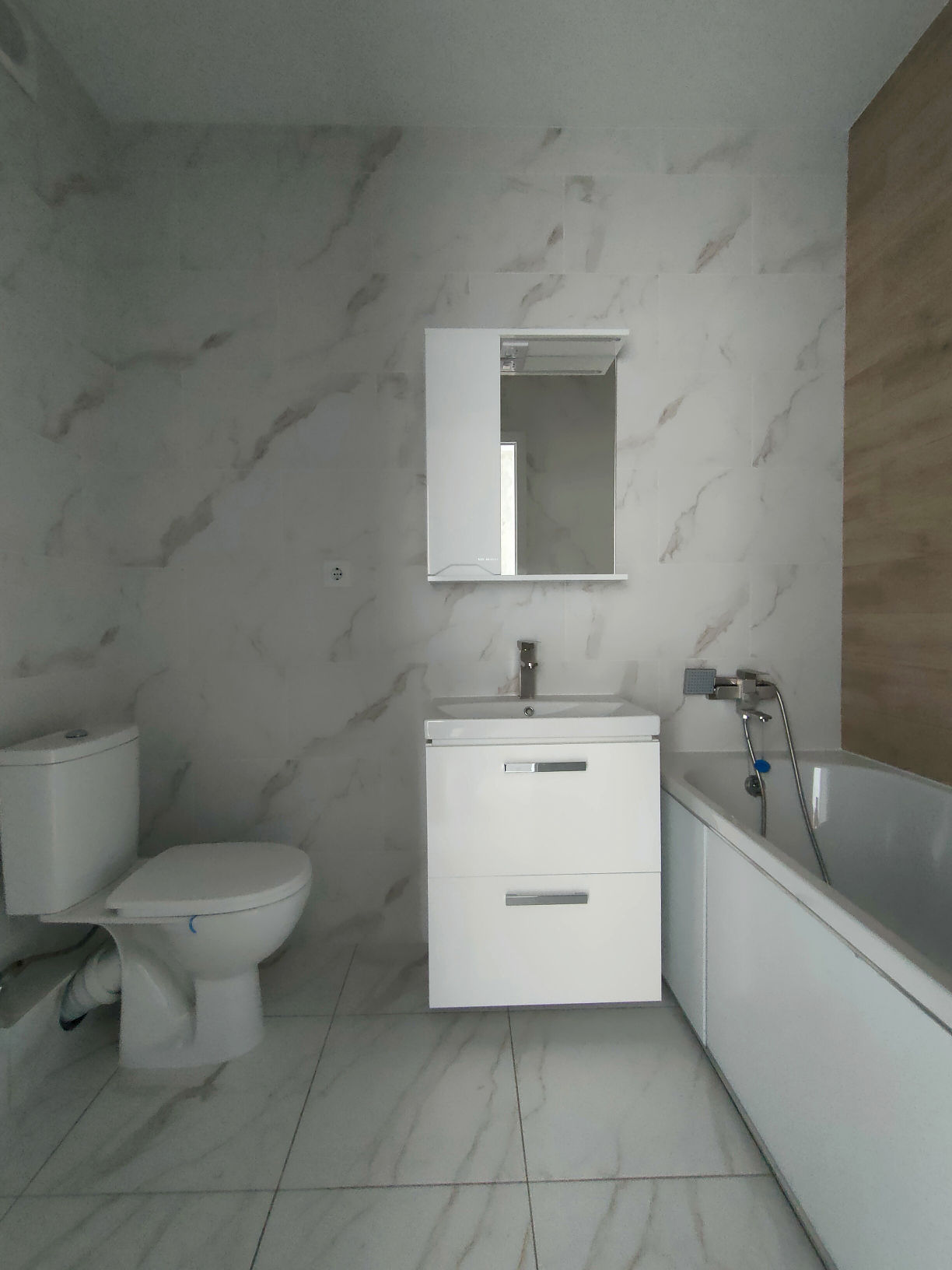Санузел облицован, установлен унитаз, бойлер, ванна, полотенце-сушител, выводы под стиральную машину.