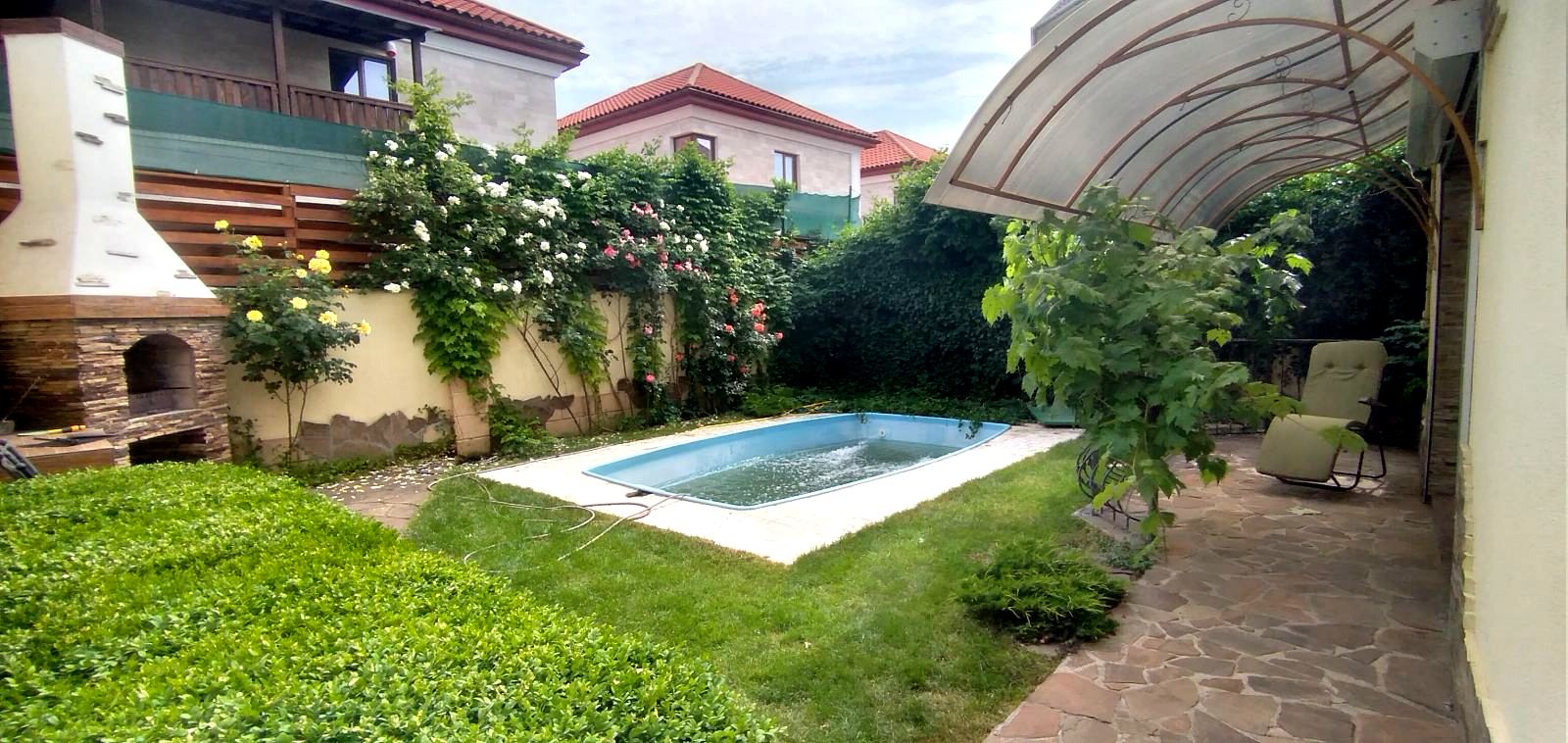 Во дворе - зона отдыха, барбекю, летний бассейн с террасой, зелёный газон.
