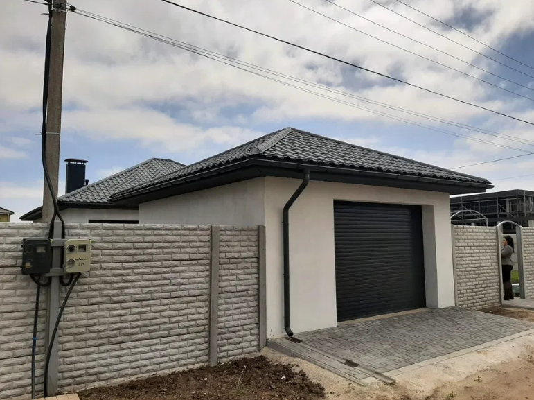 На участке гараж 27 кв.м на пультовых роллетах. Двор выложен плиткой.