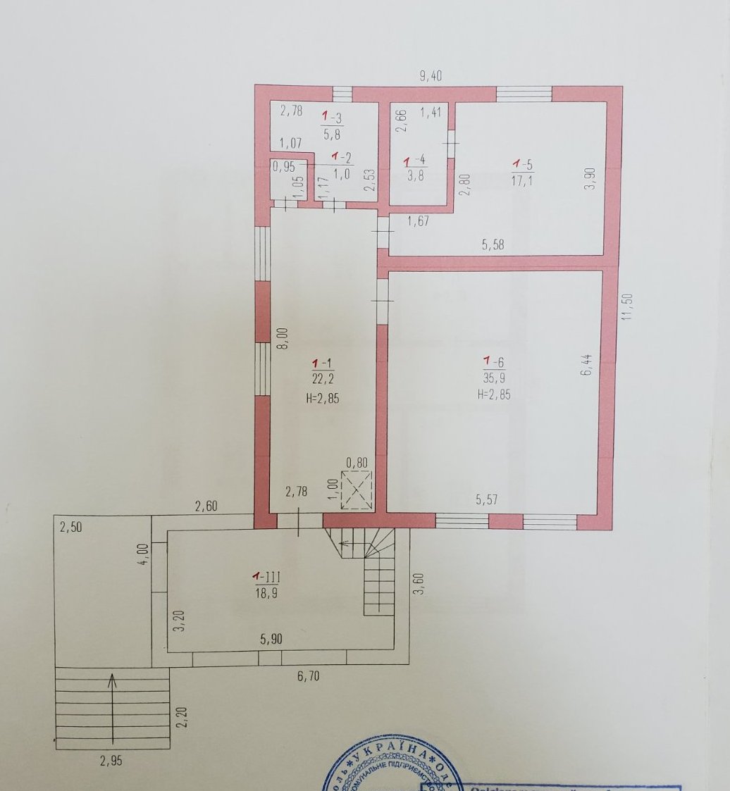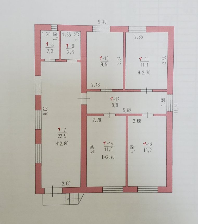 5 комнат, кухня-столовая, 2 санузла, топочная, гардеробная.