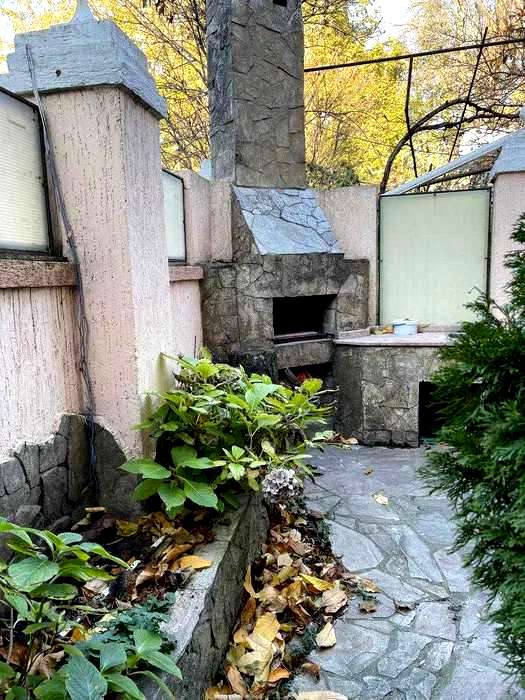 Уютный маленький дворик с красивыми насаждениями, ландшафтным дизайном и зоной барбекю.