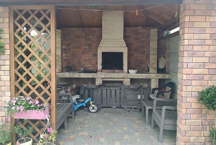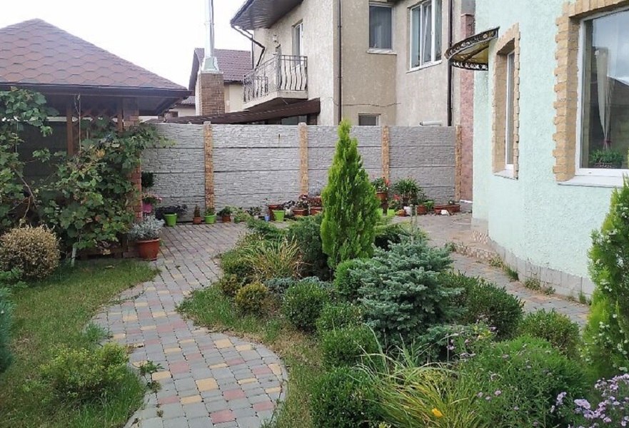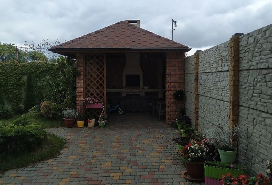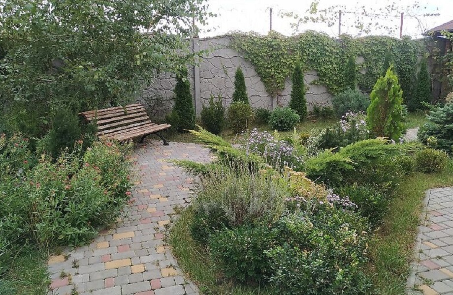Интересно выполнен задний двор с беседкой и барбекю, с хвойными растениями.