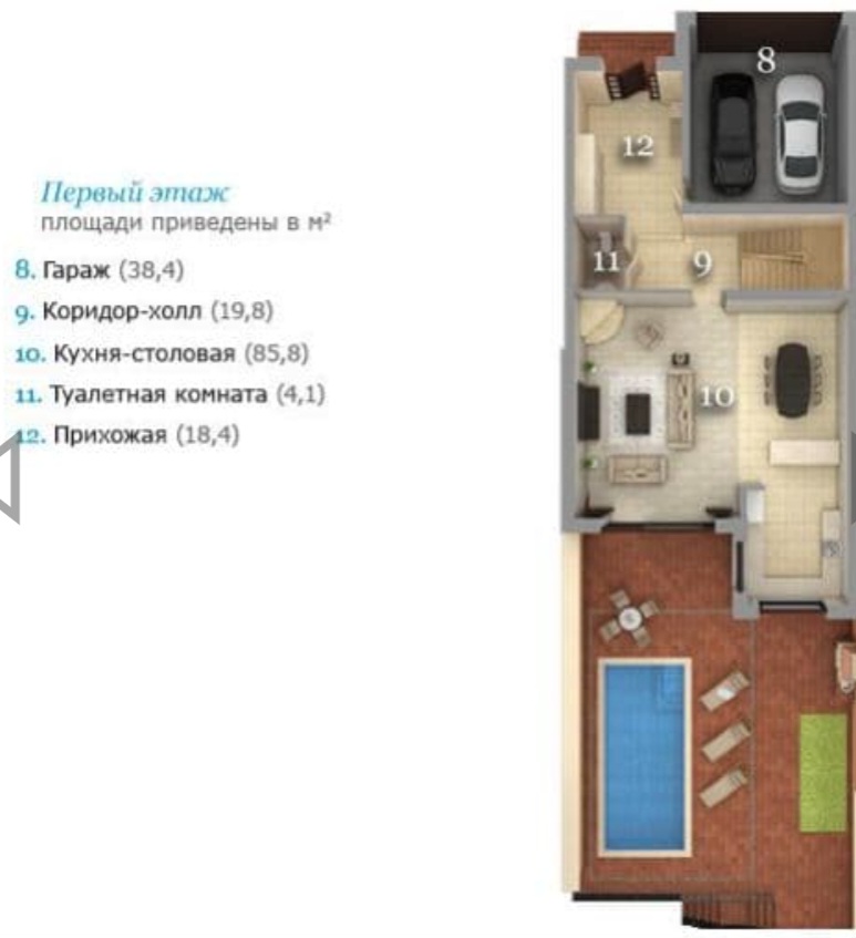 2 этаж: холл, гараж, сан.узел гостевой, мастер-спальня, мастер-сан.узел, гардеробная.