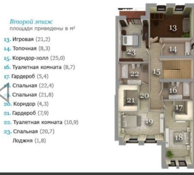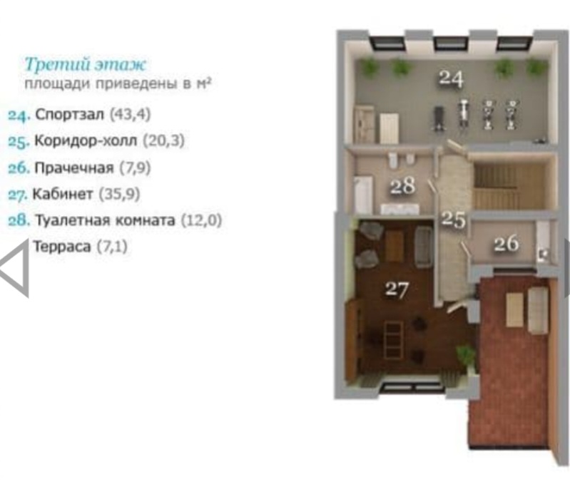 3 этаж - 3 спальни, 2 сан.узла, постирочная комната, 1 балкон, 1 гардеробная.