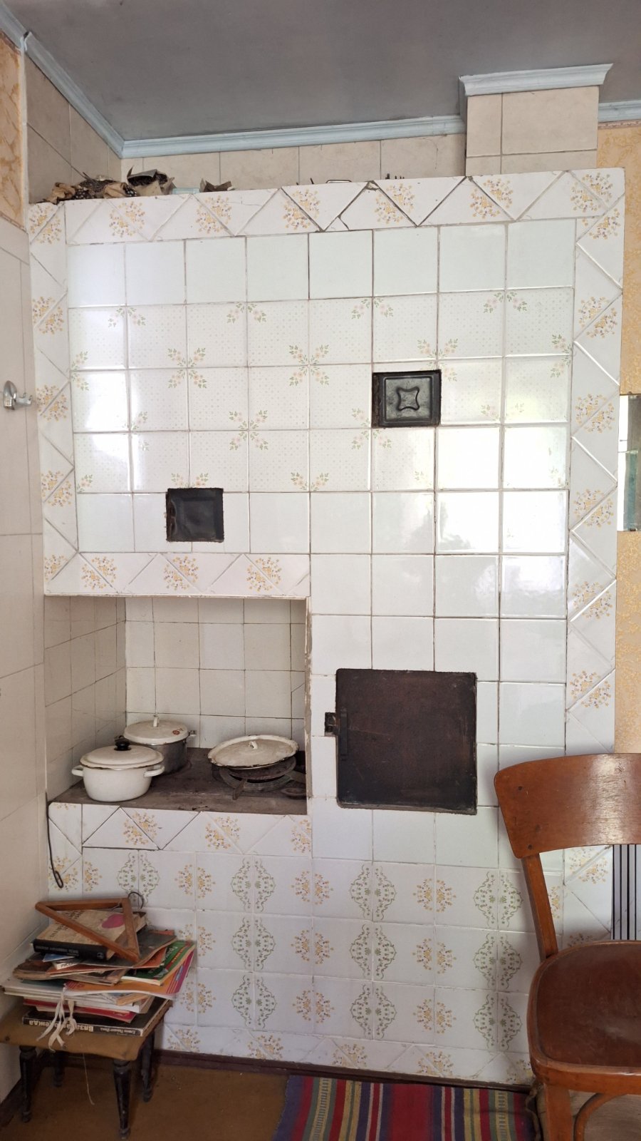 Печное отопление, труба проходит через второй этаж.