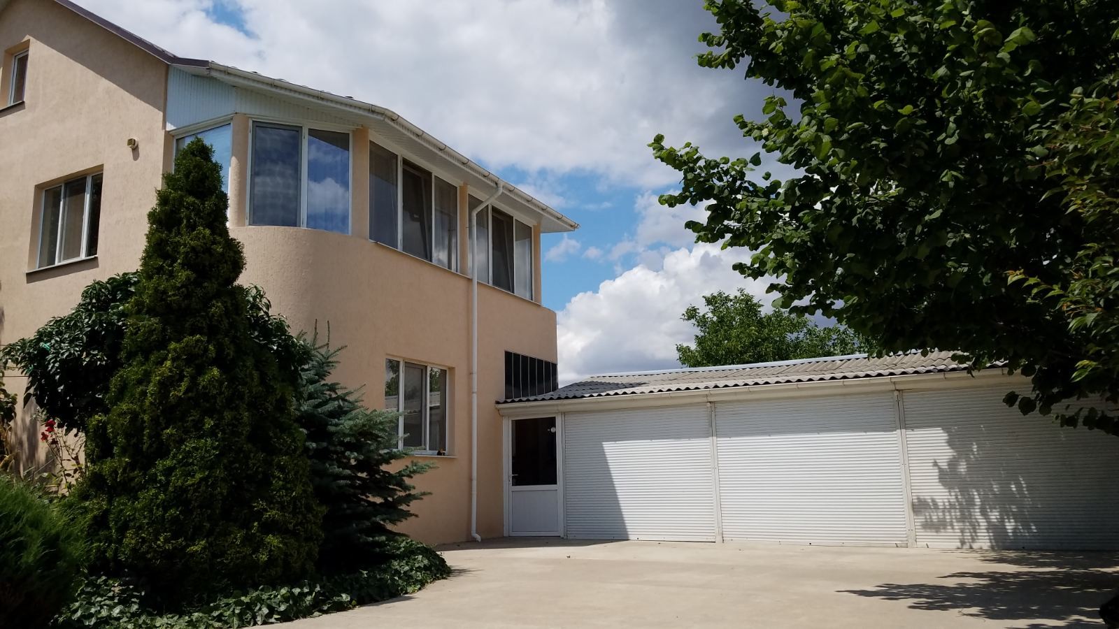 Большой, ухоженный двор с хвойными деревьями