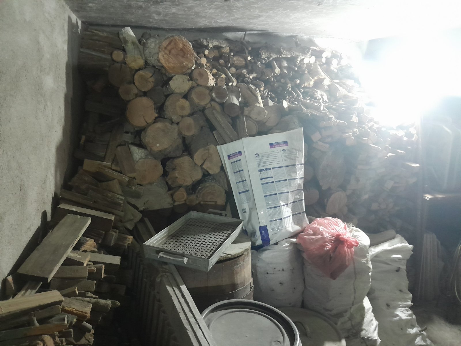 В доме две комнаты, кухня и прихожая. Есть печка. Под домом огромный подвал на три комнаты.