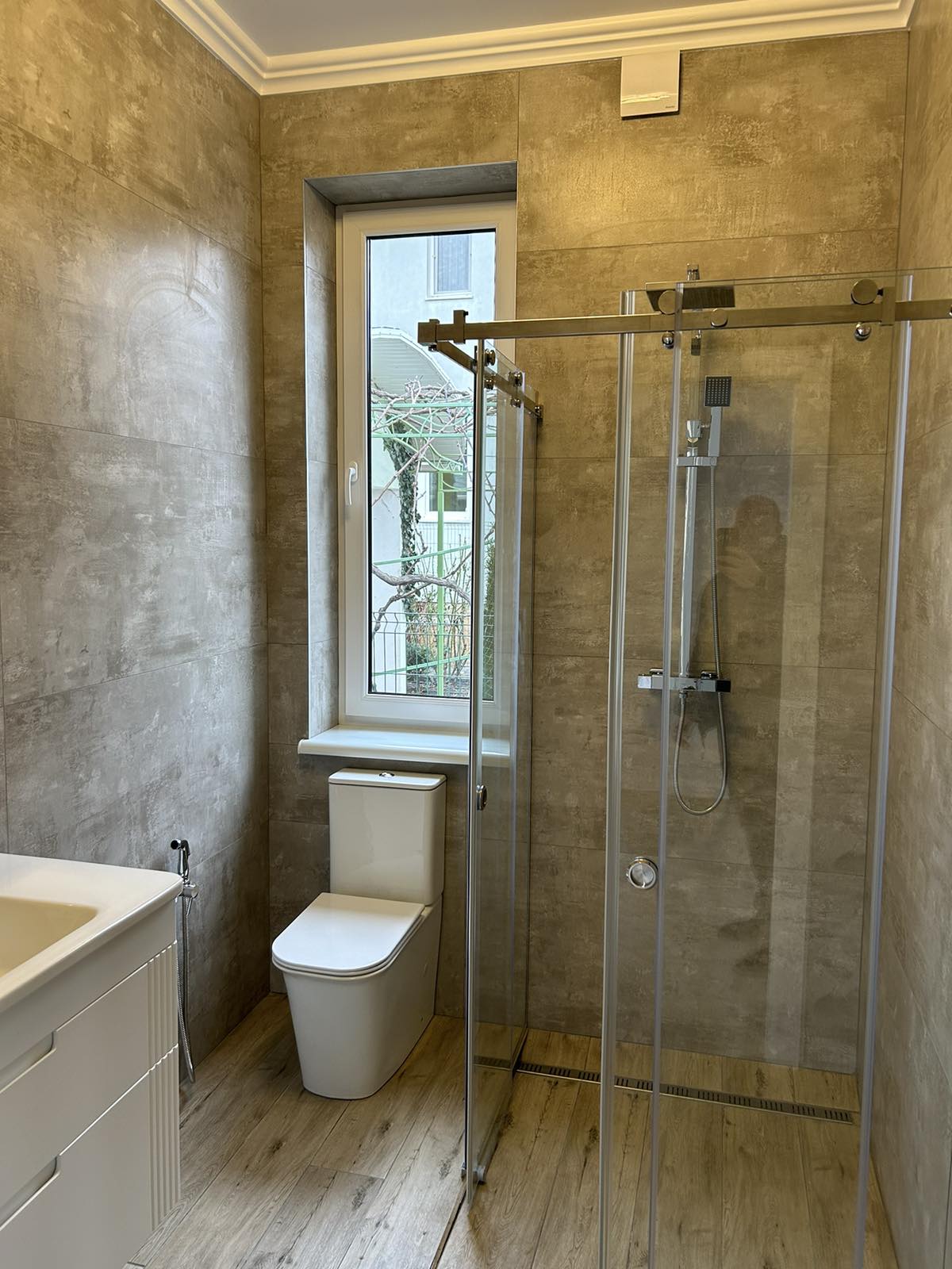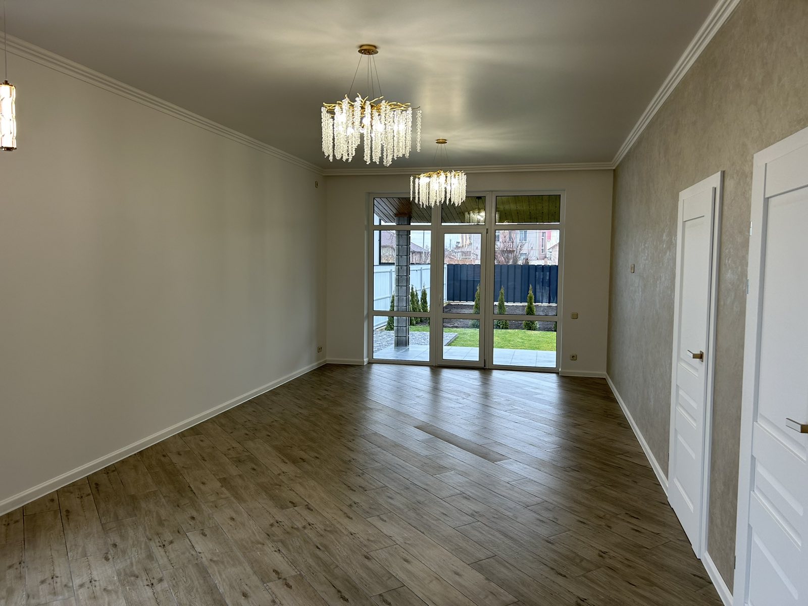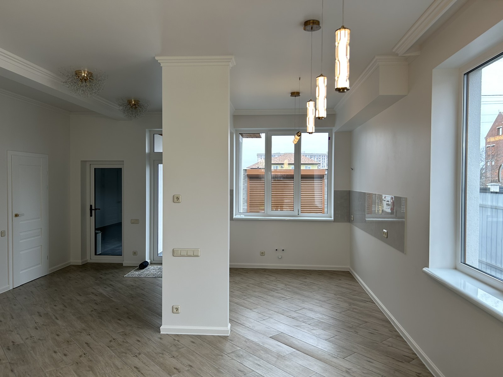 В доме просторная кухня-студия (50 кв.м.) три комнаты, 2 санузла, котельная, гардероб, гараж, подвал.