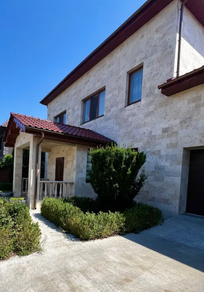 Будинок дуже теплий, повністю обкладений натуральним каменем - травертин. Товщина стін 50 см. Дерев'яні вікна з червоного дерева меранті. Дах - натуральна черепиця Braas.