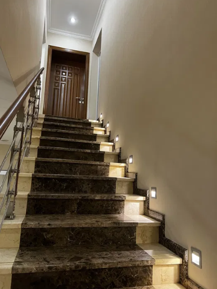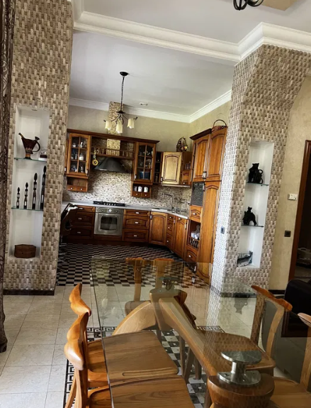 Кухня, двері, меблі - натуральний дуб; підлоги та сходи - натуральний мармур.