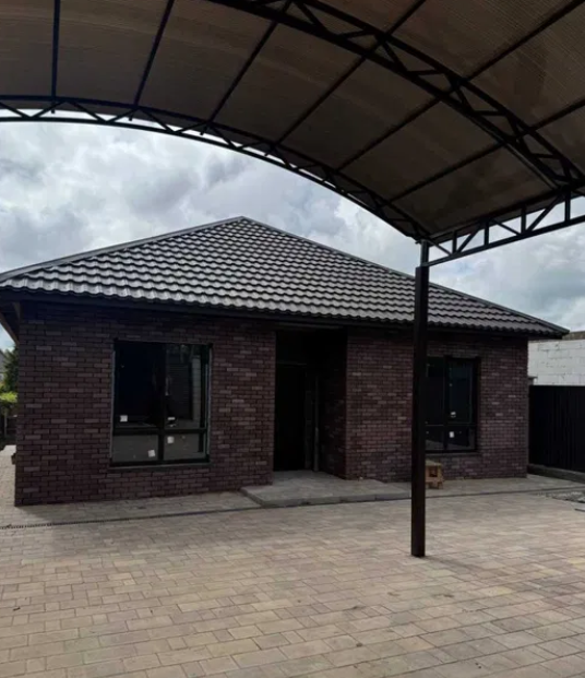 Двор вымощен плиткой, есть навес для авто, аккуратный забор и приятные соседи.