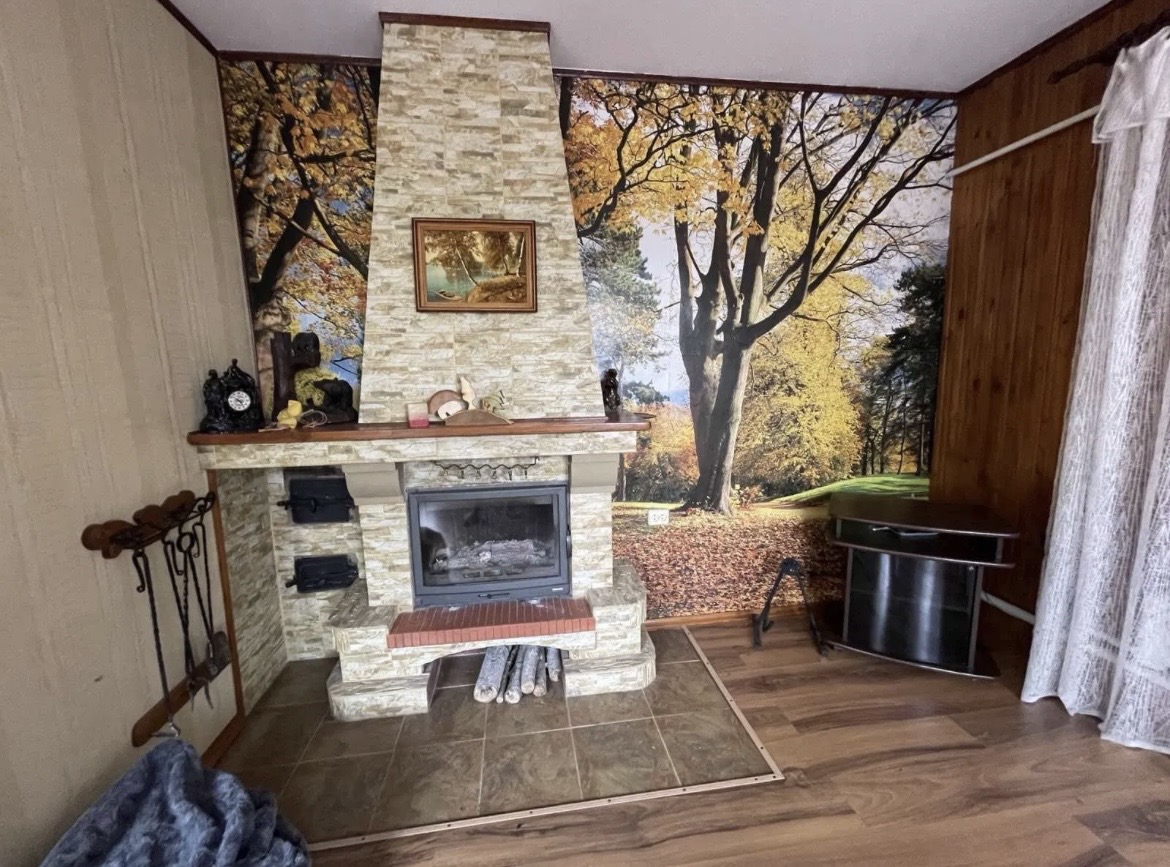 На первом этаже туалет, кухня, гостиная 40м2, гостевая спальня и каминная, где также есть встроенная печь (третий вид отопления).