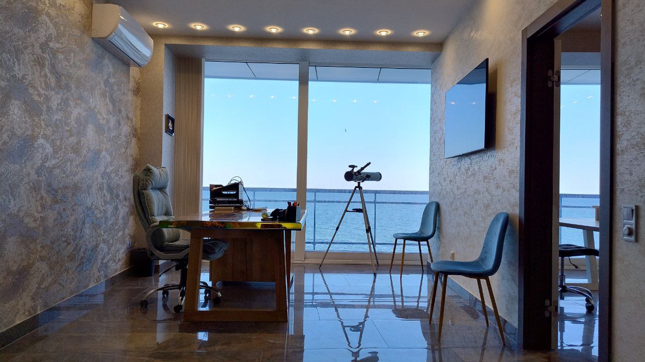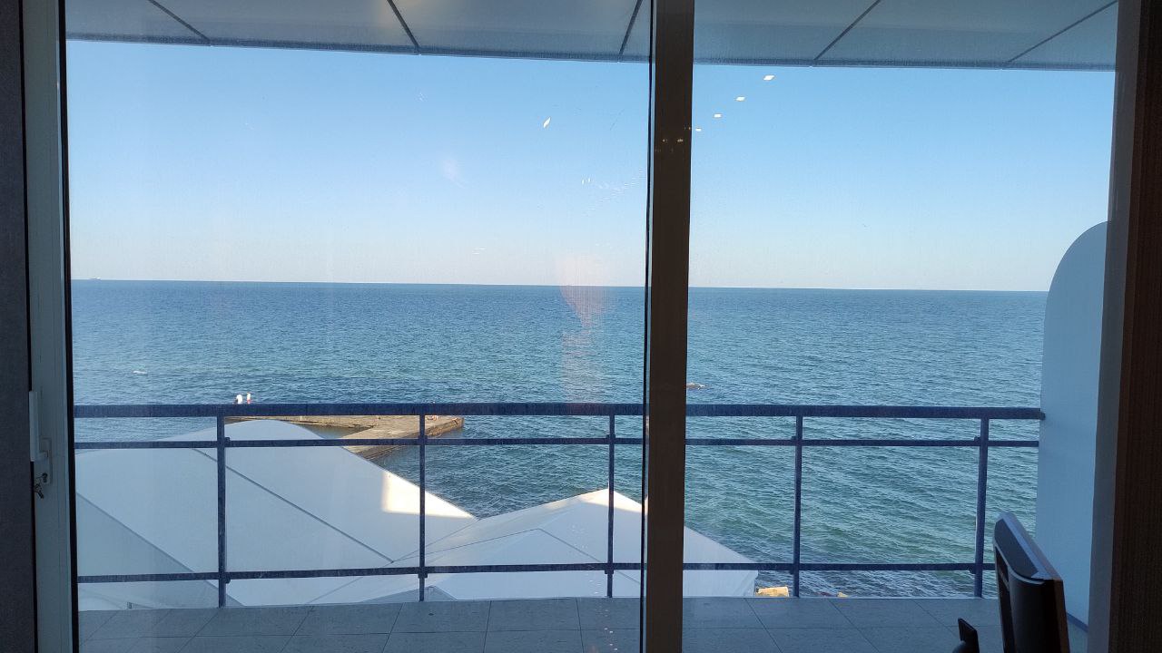 С видом как во двор, так и панорамным видом на море(широкий балкон с отдельными выходами).