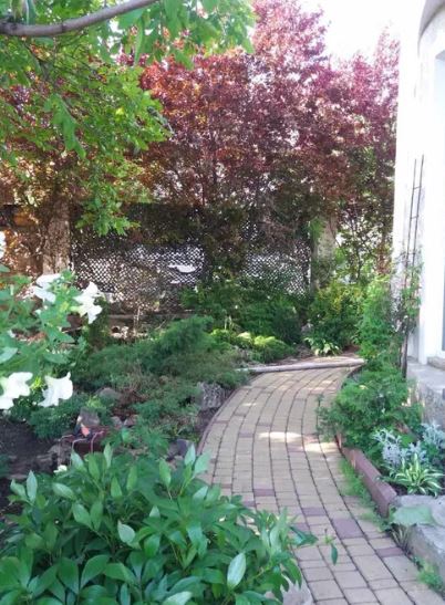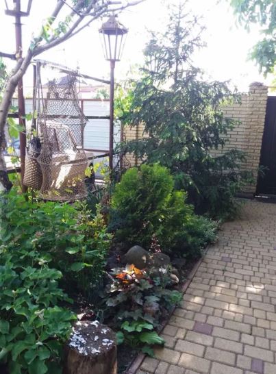 На участке много фруктовых деревьев и хвойных растений.