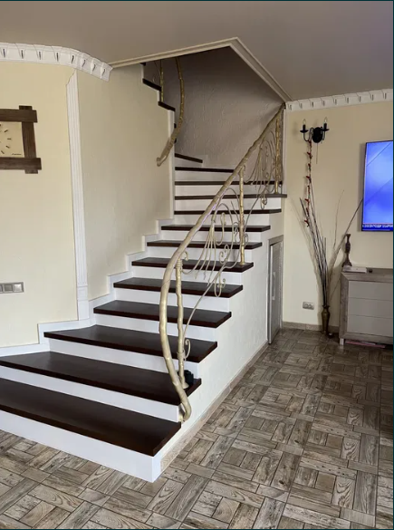 1 этаж - гараж, санузел с душевой, котельная, выход в гараж из дома, большая кухня-студия и мангальная. Лестница из массива ясеня, под лестницей удобная кладовая.
