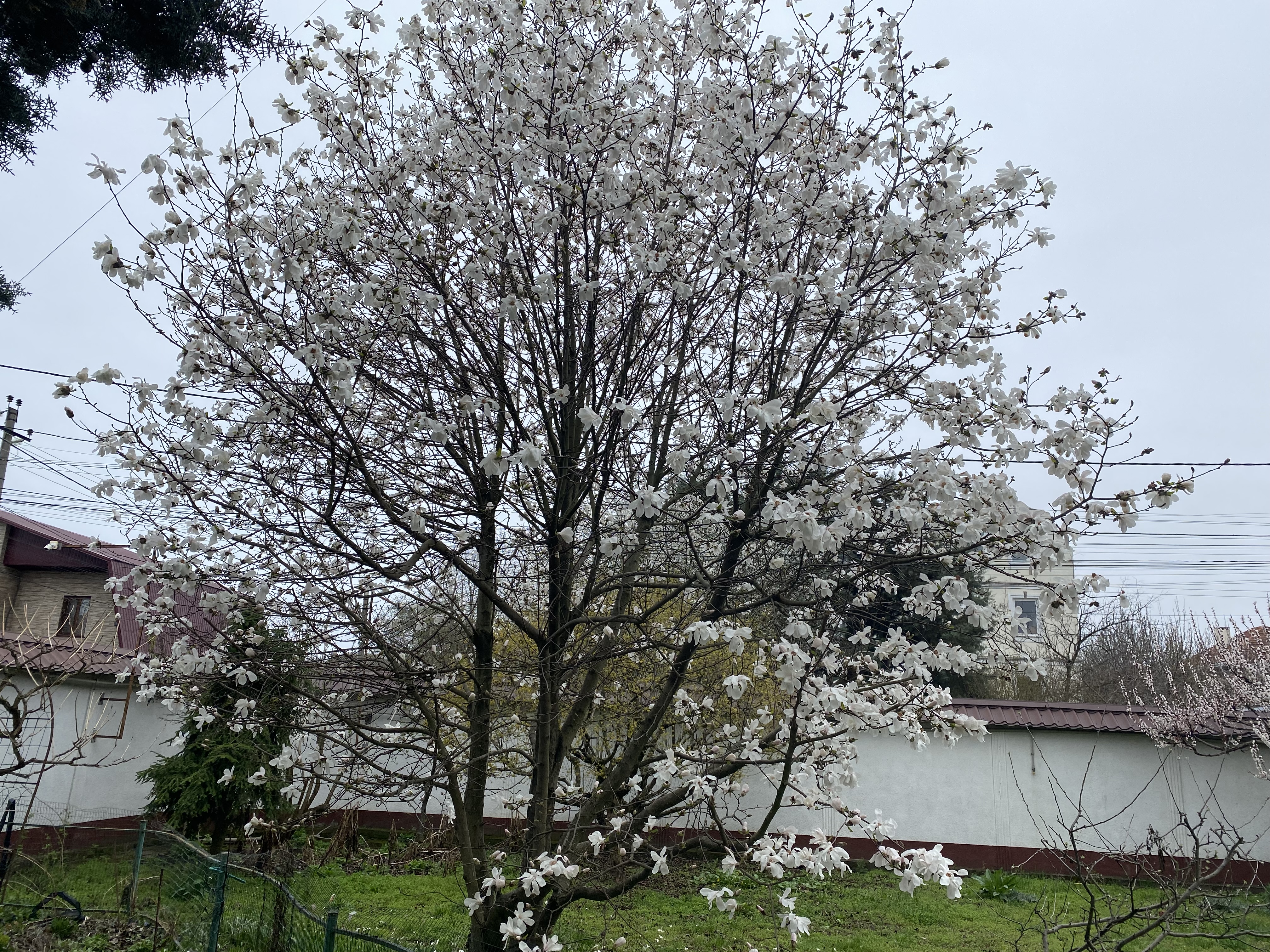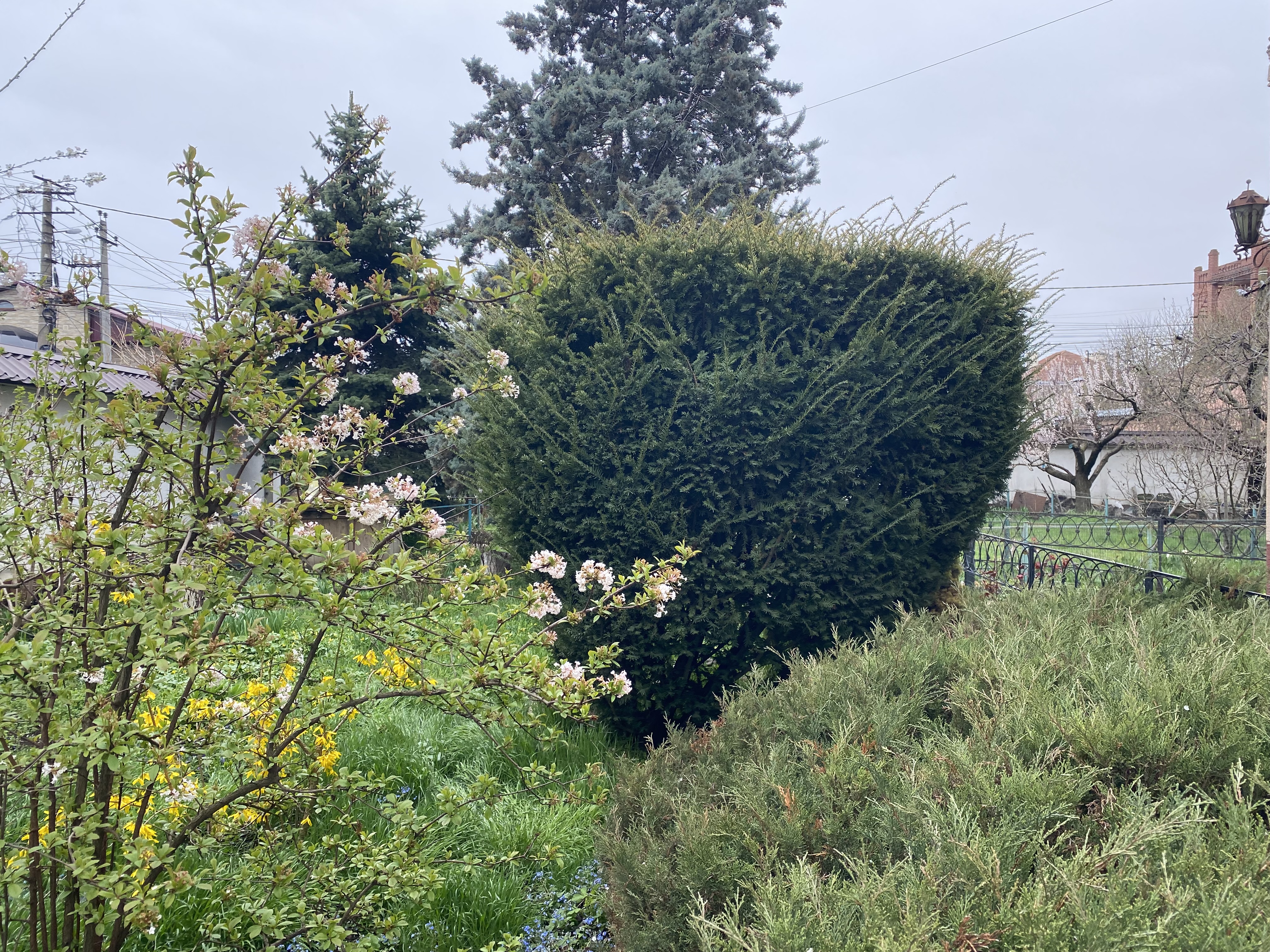 Участок радует глаз в любое время года: хвойные деревья, фруктовые посадки, цветущая магнолия и цветники с береклестом и лилейниками. Это не просто двор — это настоящий зелёный уголок, где можно отдыхать, встречать гостей, мечтать.