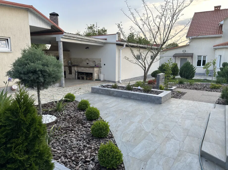 На участке сад с хвойными и декоративными растениями, мангальная зона, летний душ и туалет, а также беседка с камином - 30 кв.м.