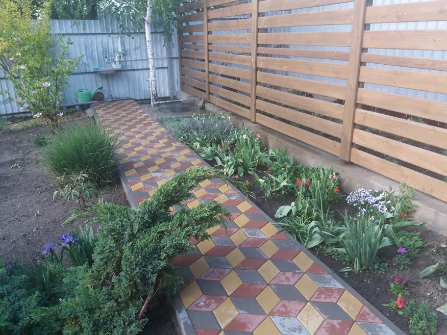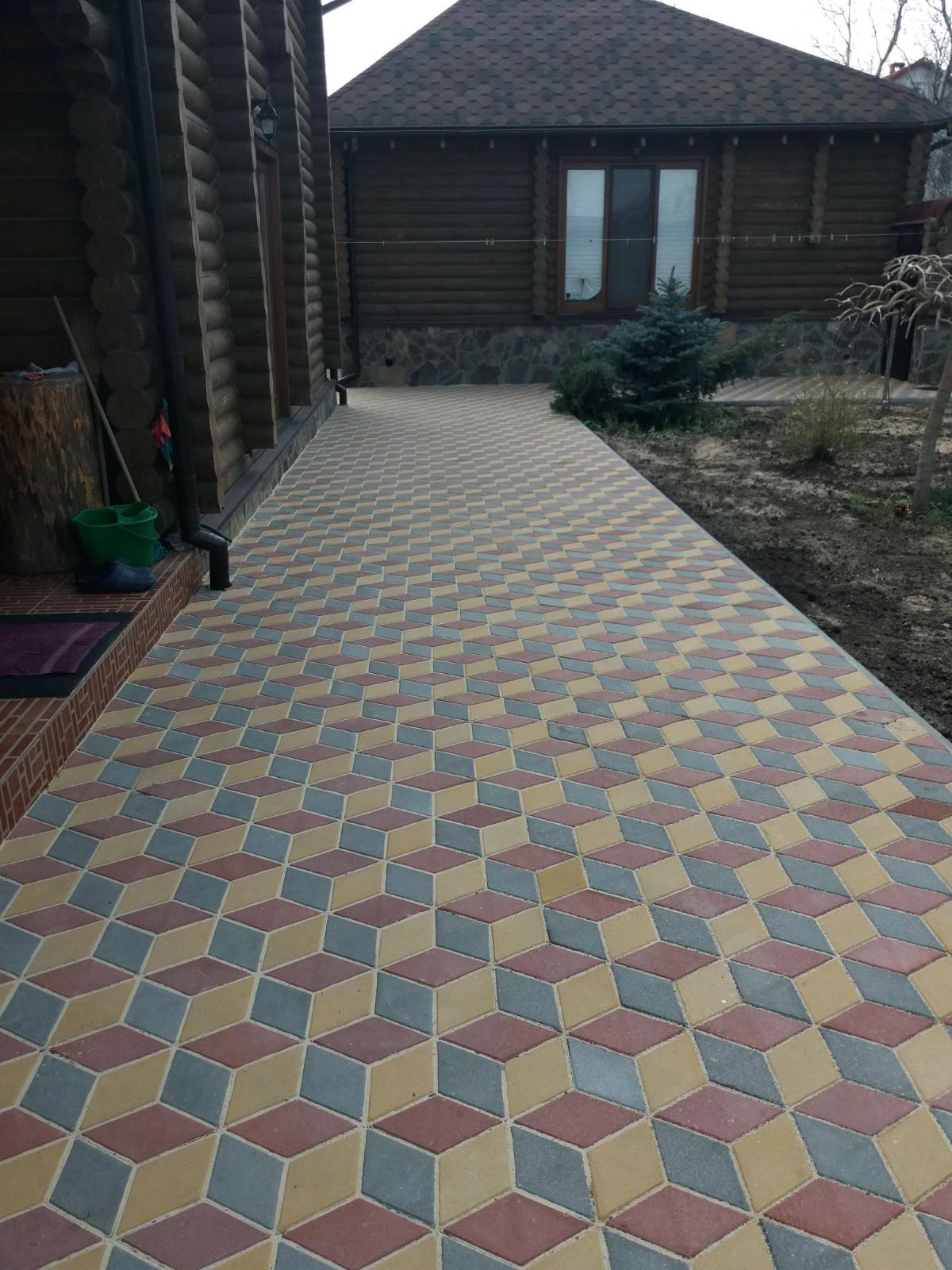 Двор вымощен плиткой, место для нескольких авто.