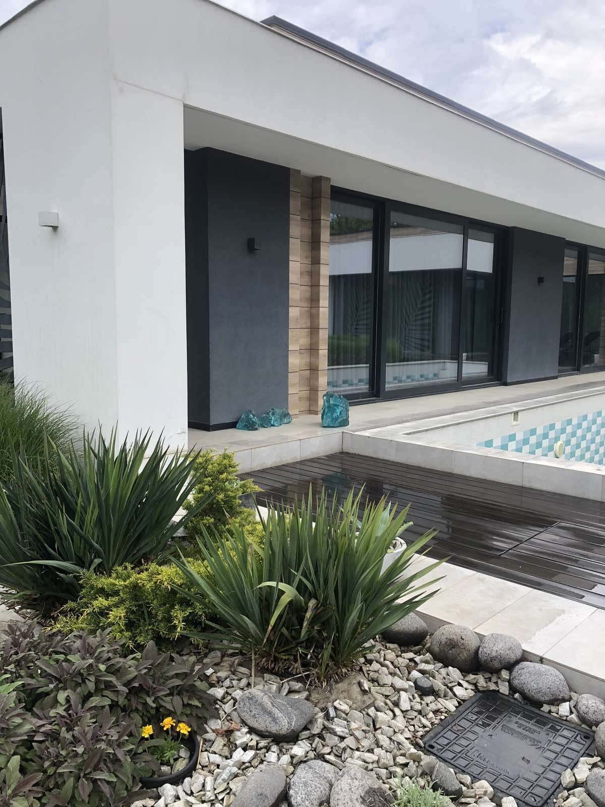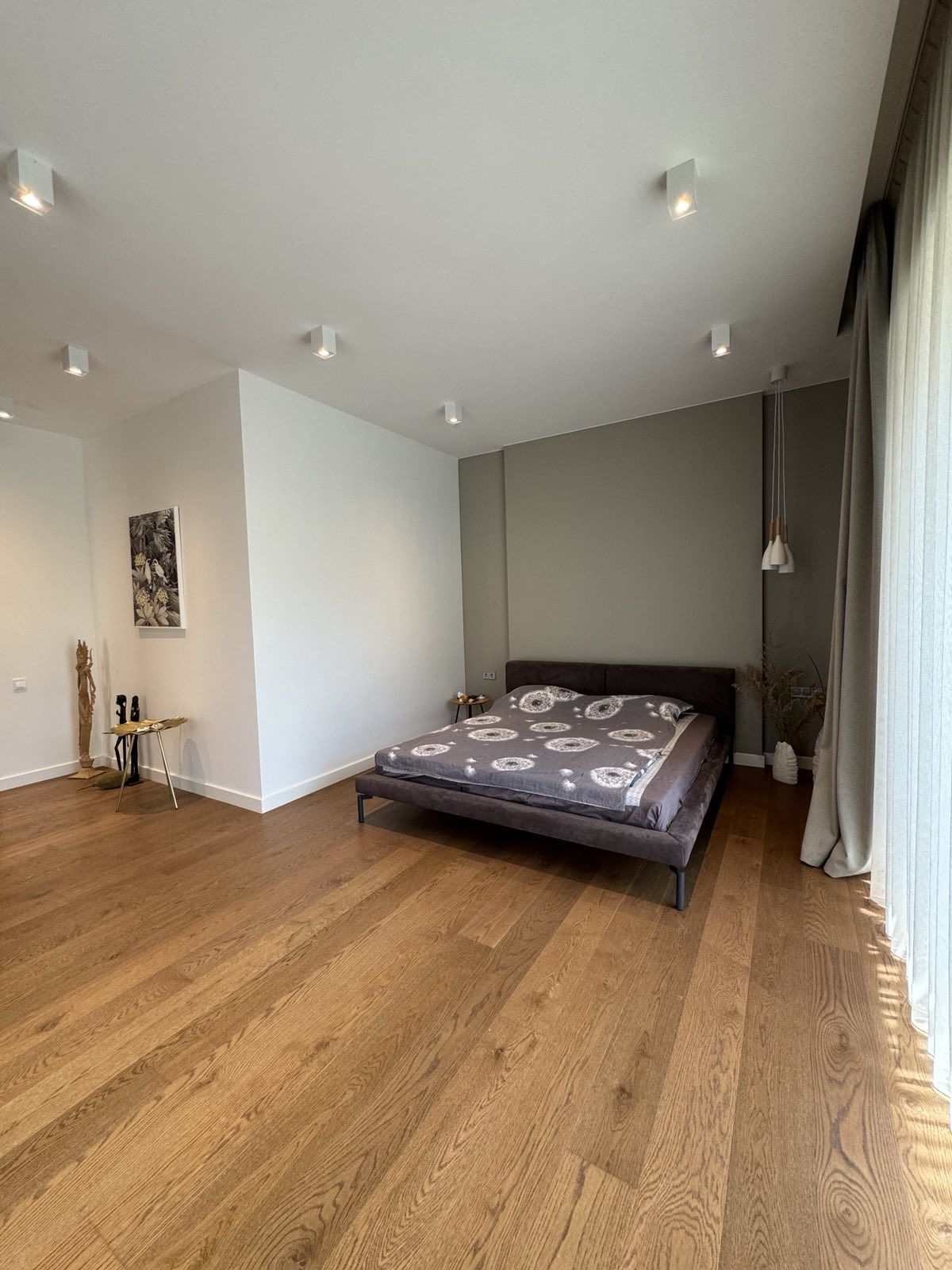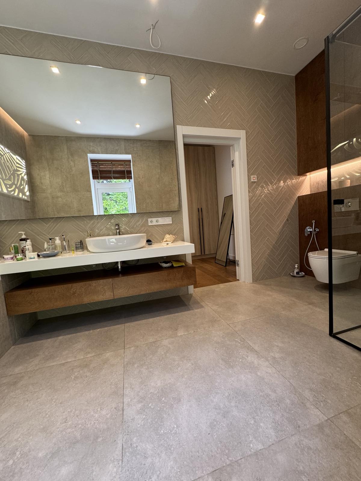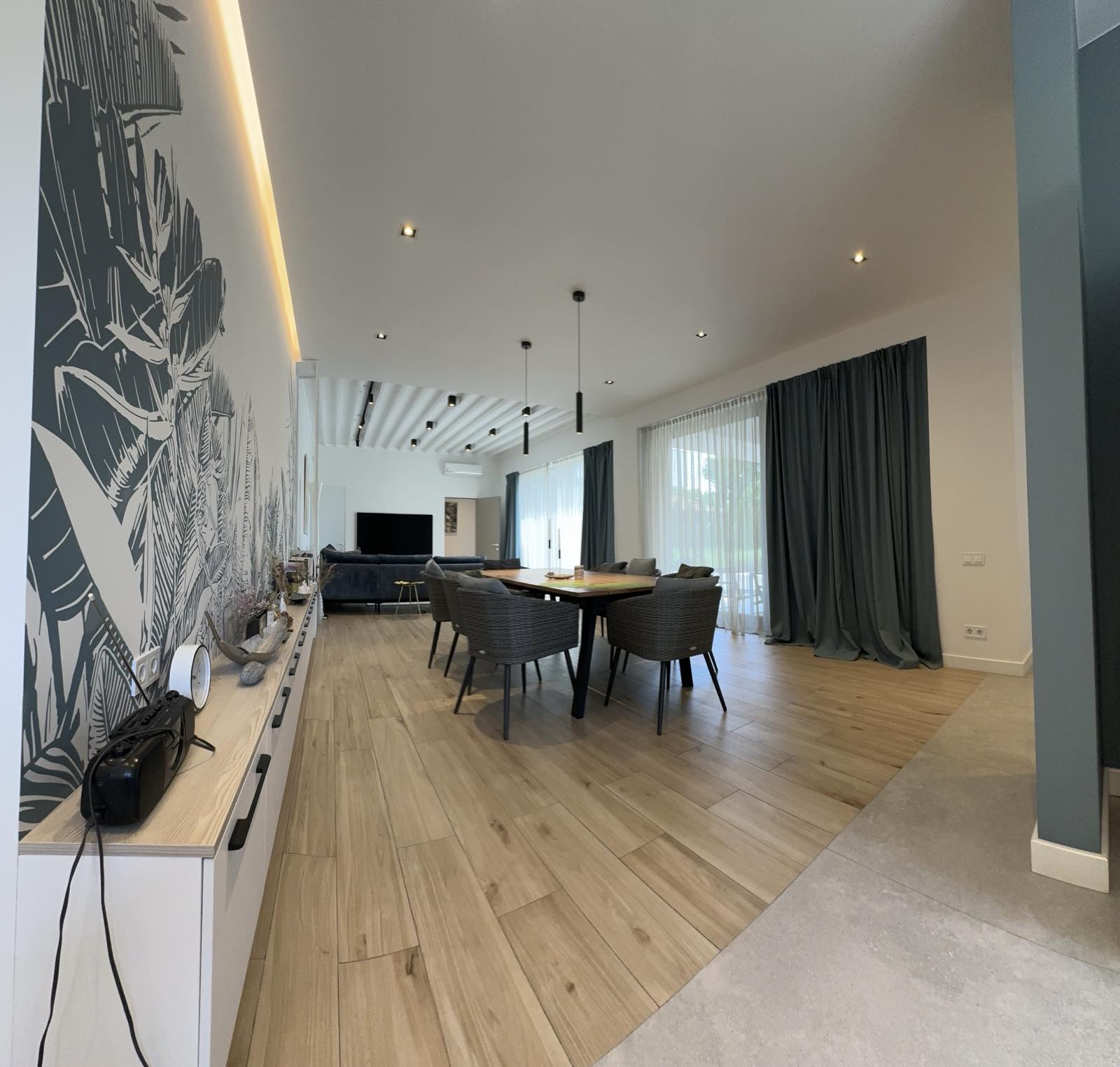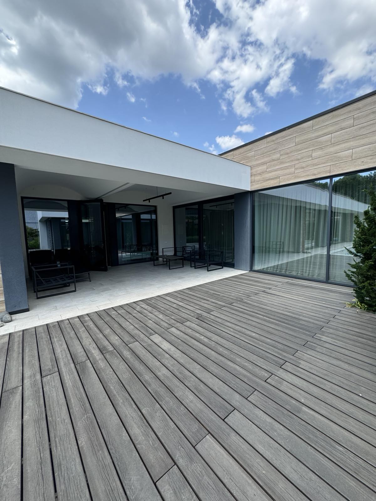 Все очень стильно, просторно и современно. Из каждой спальни свой выход на участок, при этом есть подсобные помещения разного назначения.