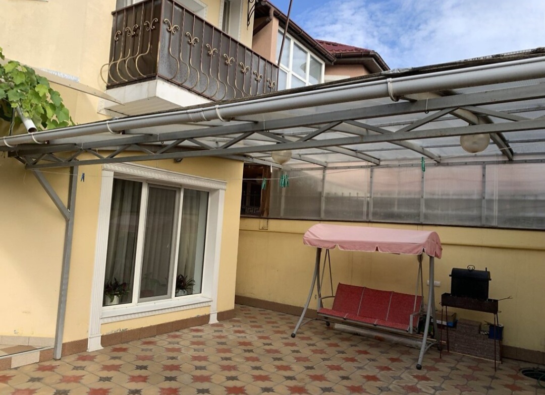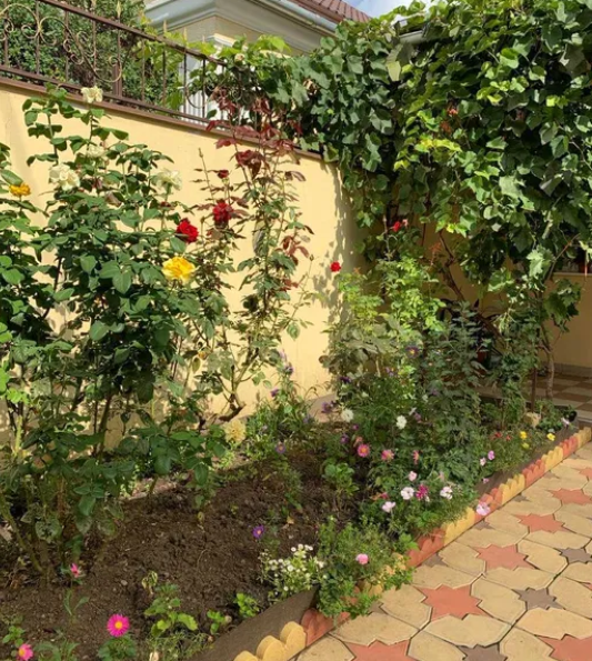 Уютный двор под навесом на 2 машины, красивая клумба с цветами и виноградом.