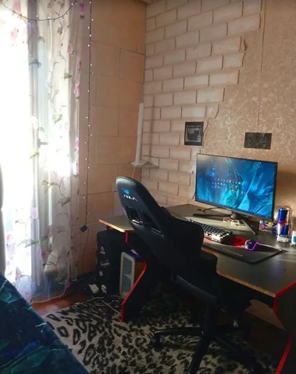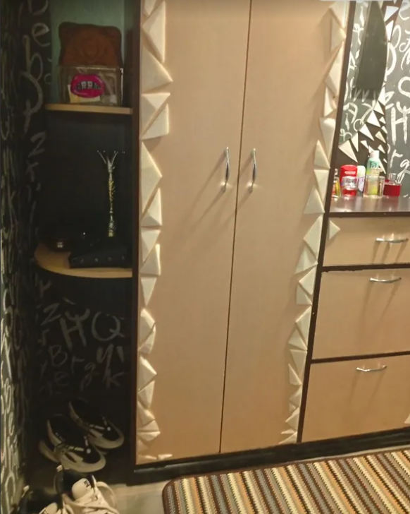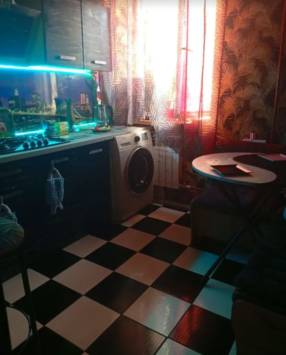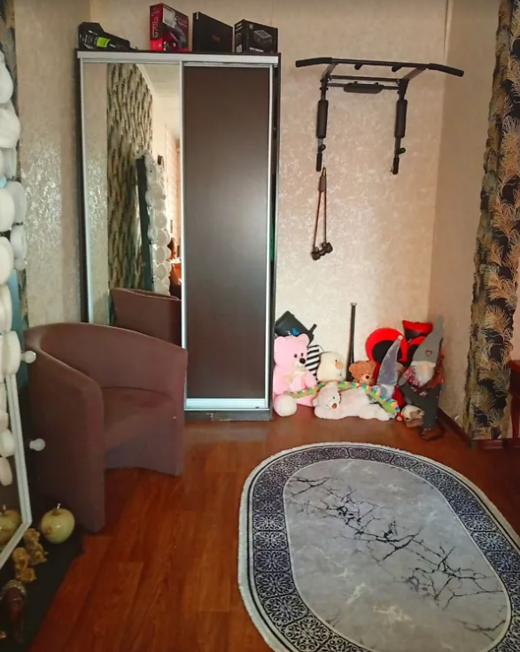 Остается: шкаф, кухонная мебель, кресла, письменный стол.