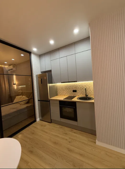 Продуманная планировка: студия с полностью обособленной спальней, кухня-гостиная и балкон.