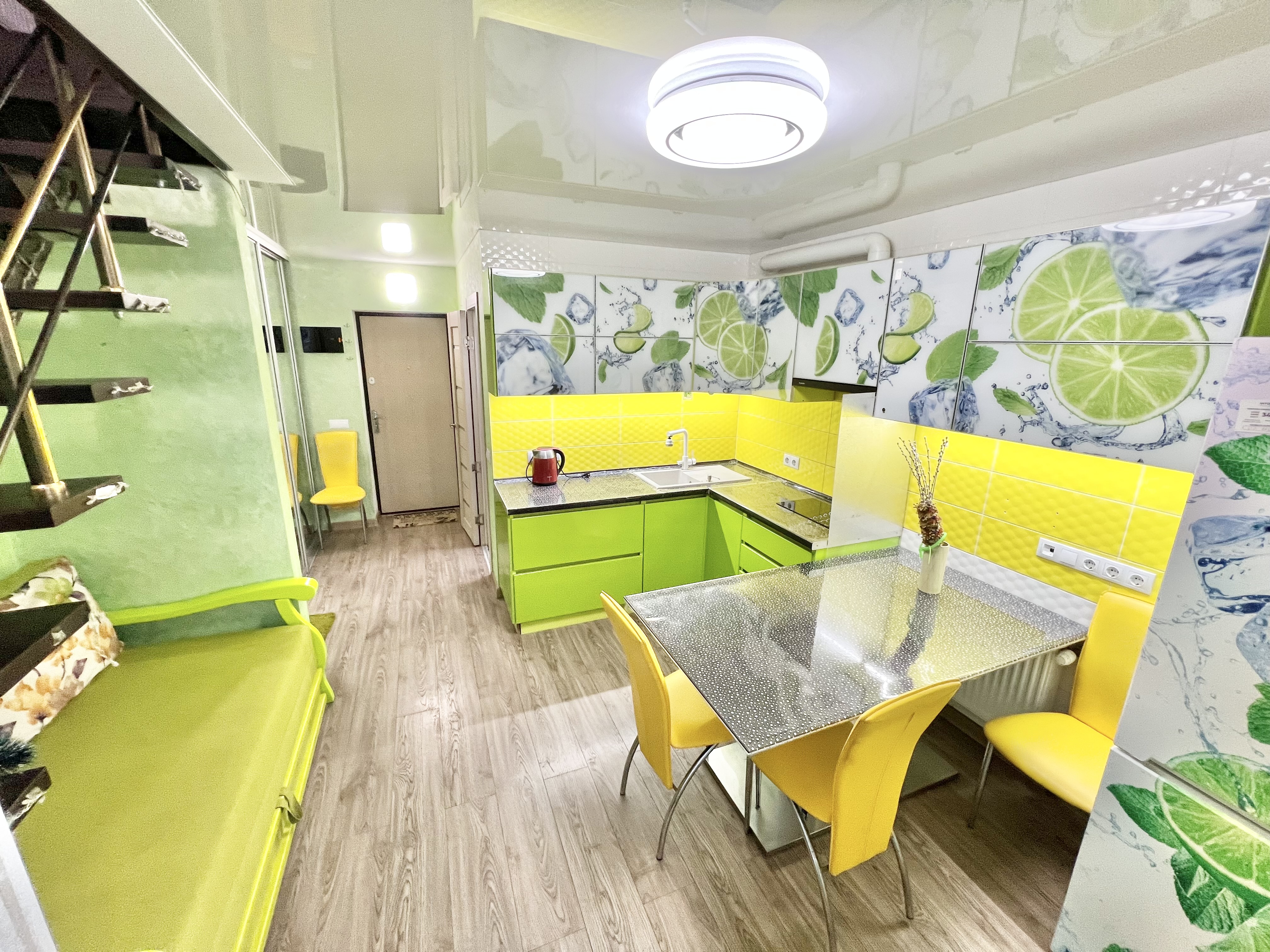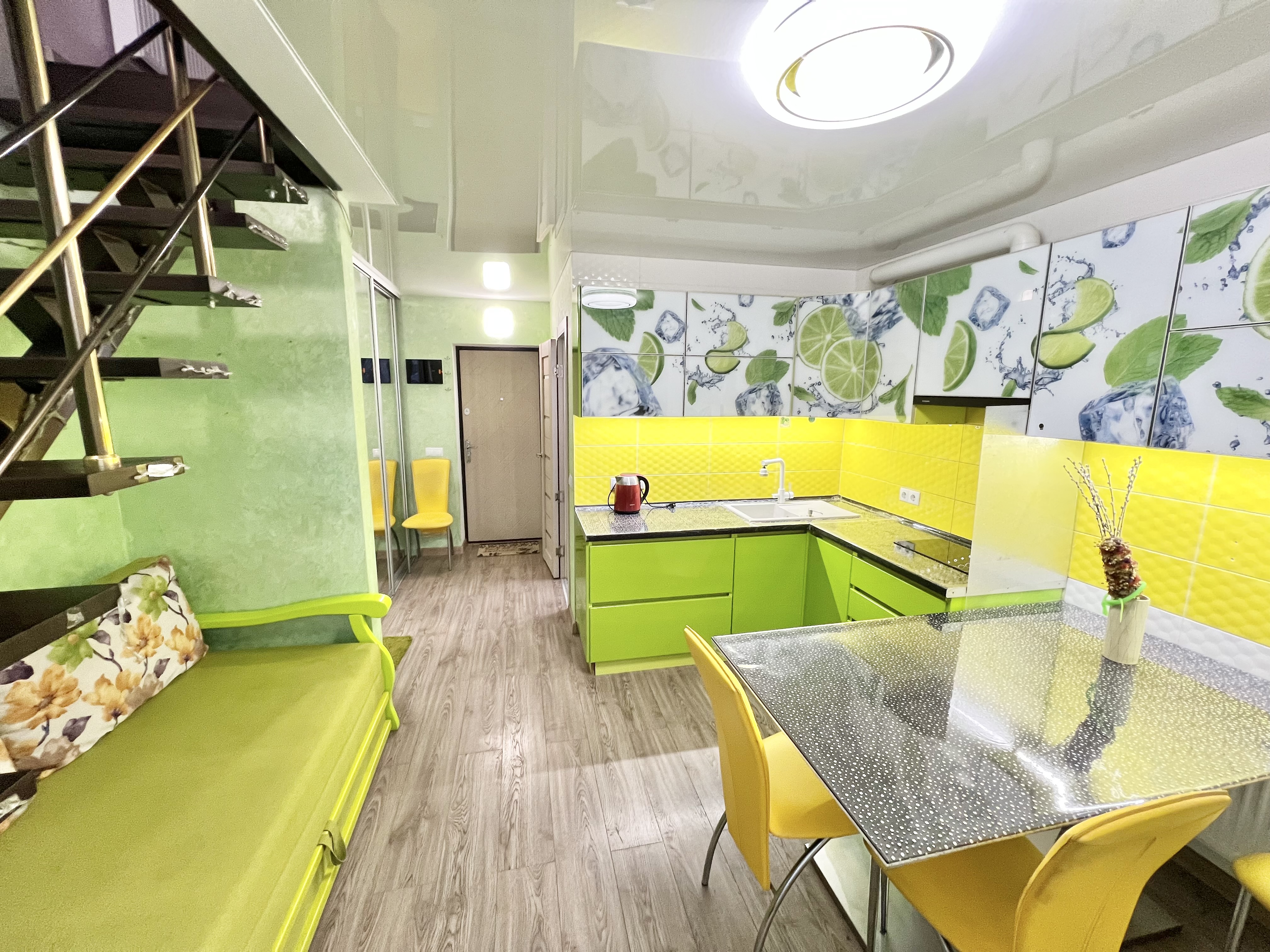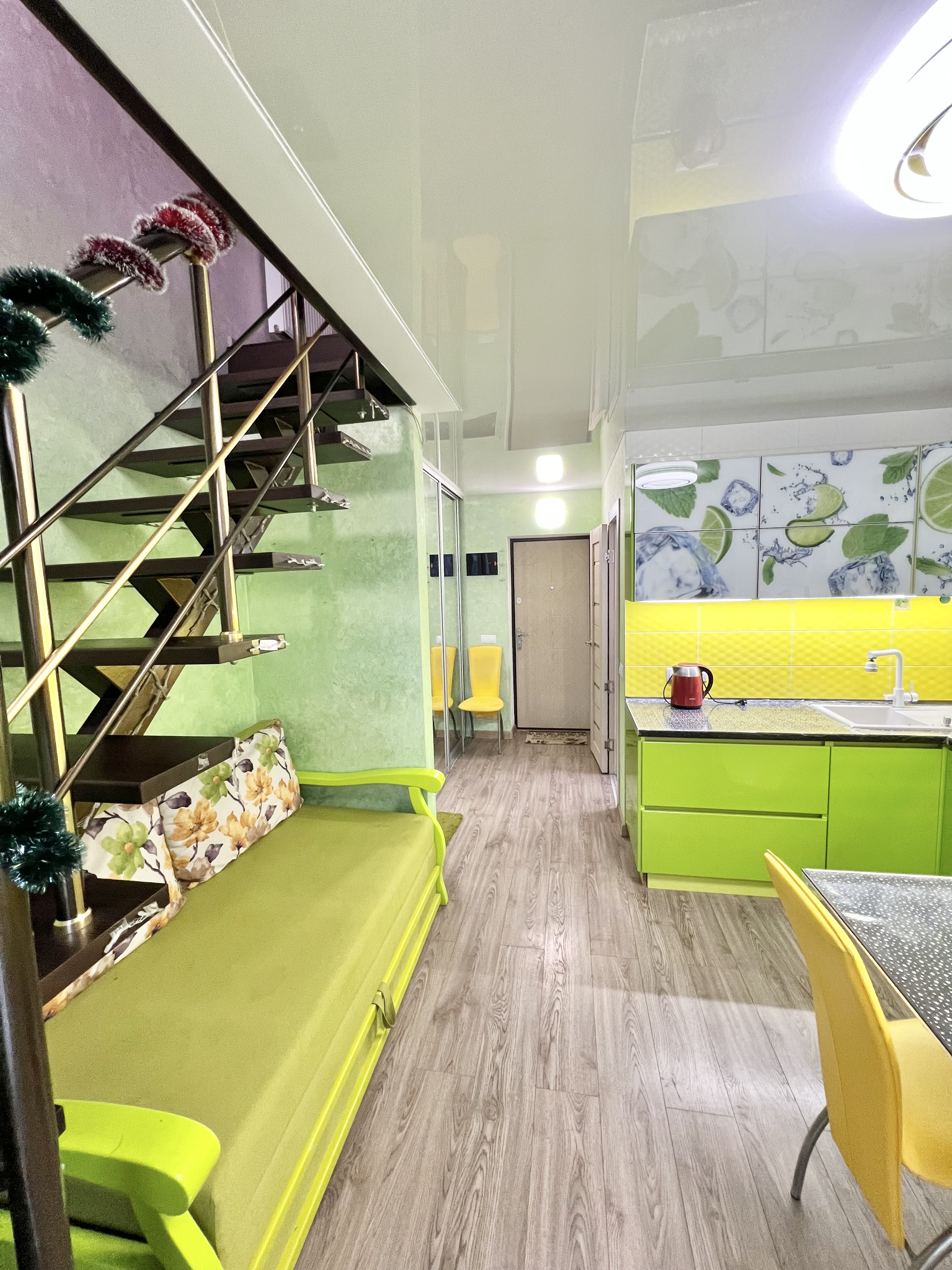 Кухня-студия с диваном, большим балконом и санузлом на первом уровне.