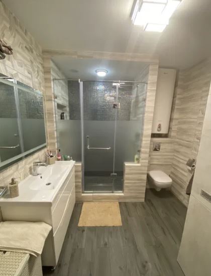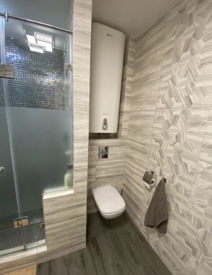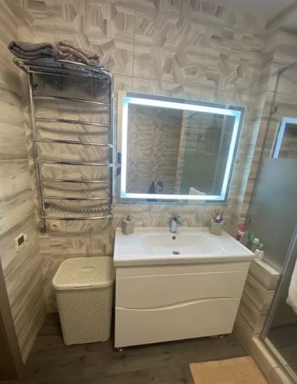 Квартира имеет достаточно большой санузел с подогревом пола и построенной по всем стандартам душевой кабиной и Итальянской сантехникой, так же встроен шкаф для стиральной и сушильной машины.