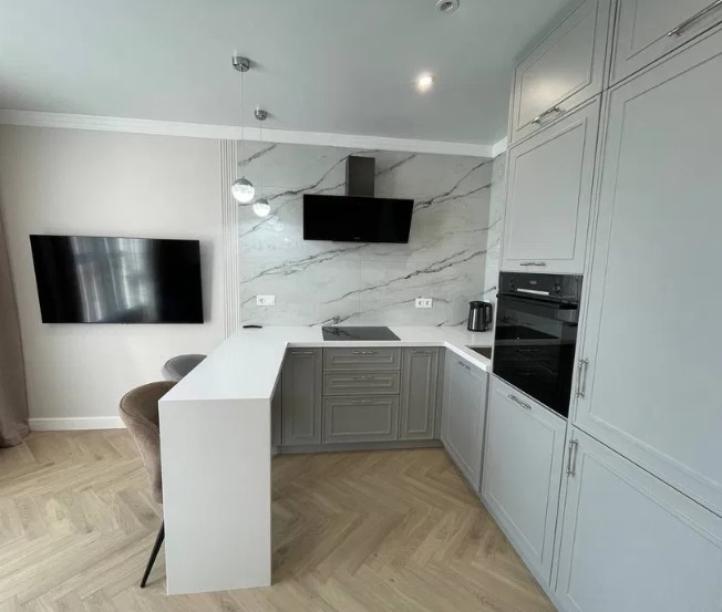 Очень светлая, уютная квартира с просторной кухней-гостиной в Аркадии. Панорамные окна с прекрасным видом на город. Современный ремонт выполнен с использованием дорогих,