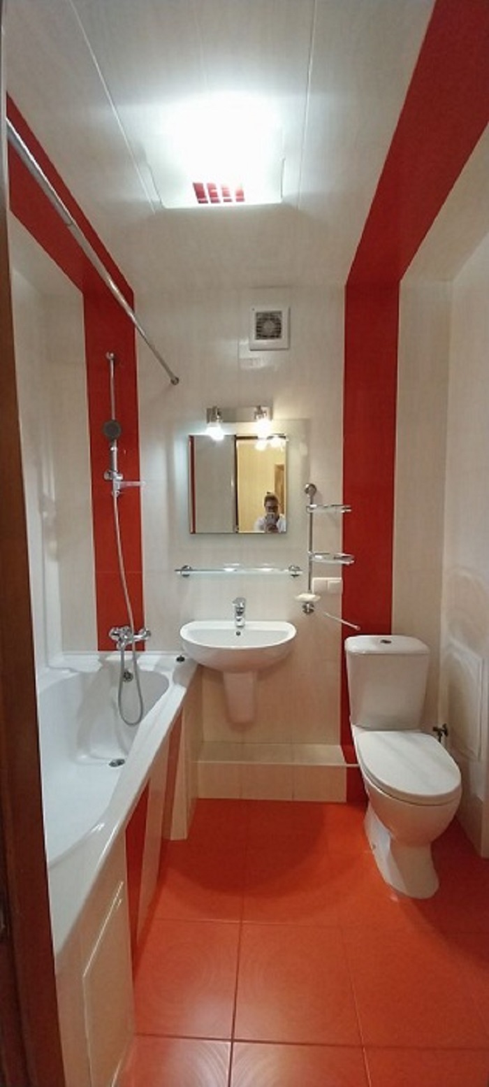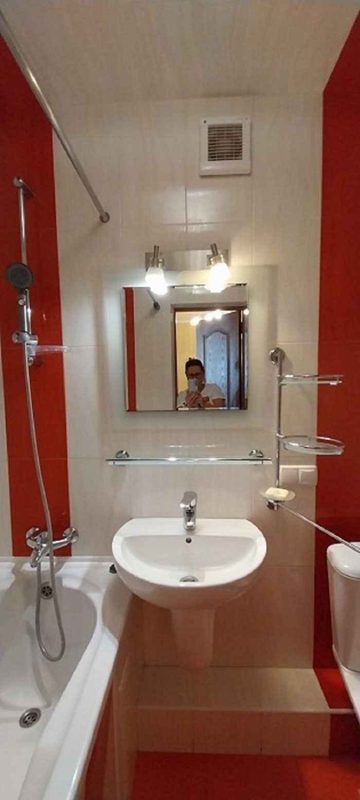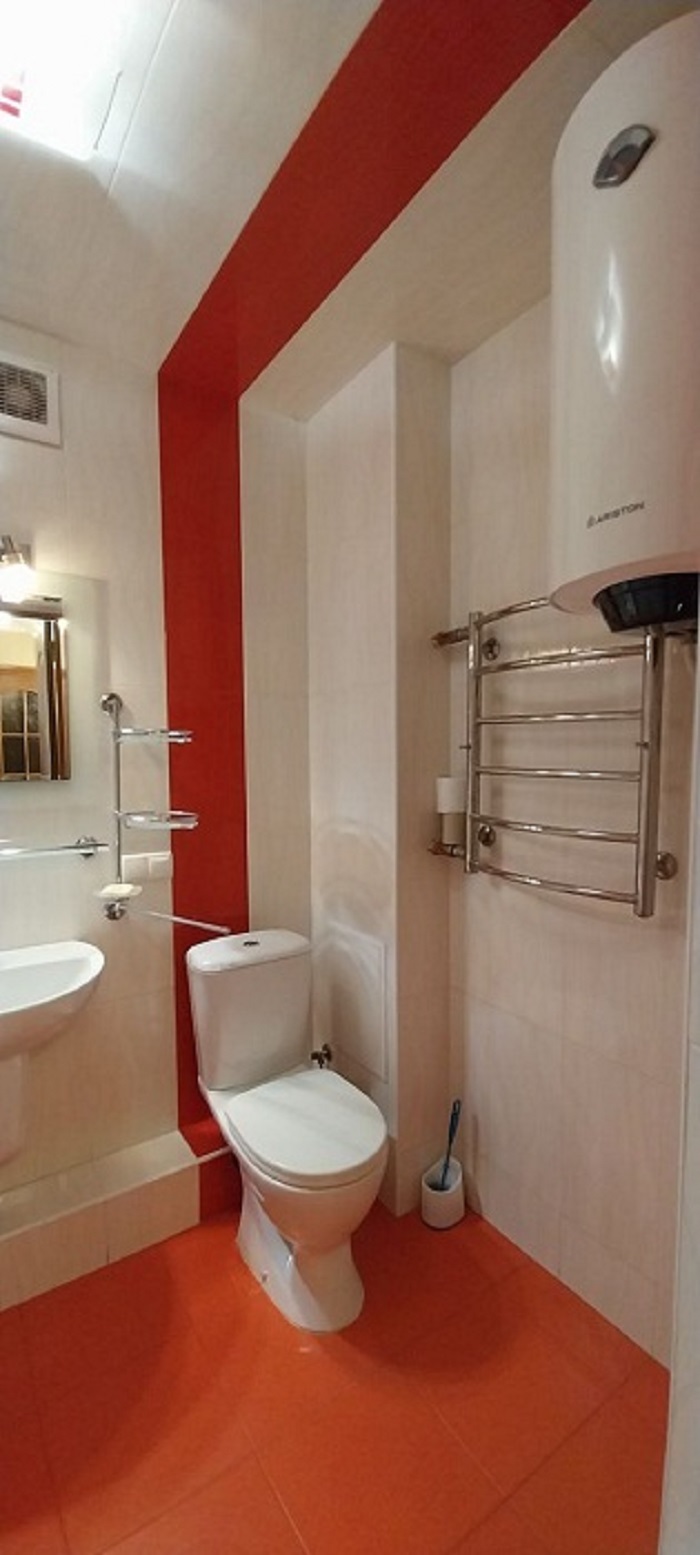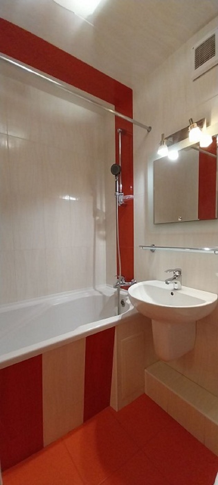 Ванная комната оформлена эффектной красно-белой плиткой, установлен бойлер. Есть гардеробная — удобно и практично.