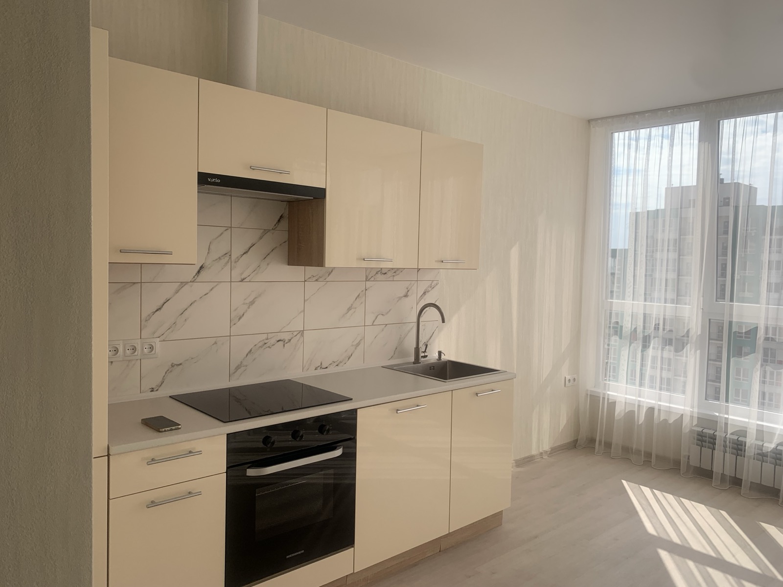 Кухня объединена с балконом, что добавляет простора и света.