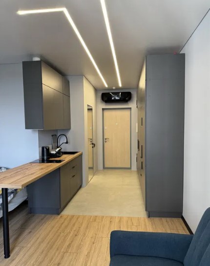 Общая 30 кв. м , зона кухни-студии с диваном и двуспальная кровать .