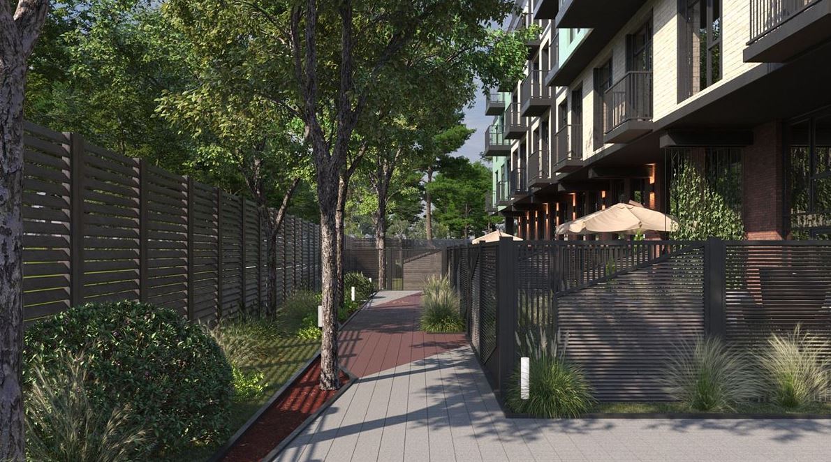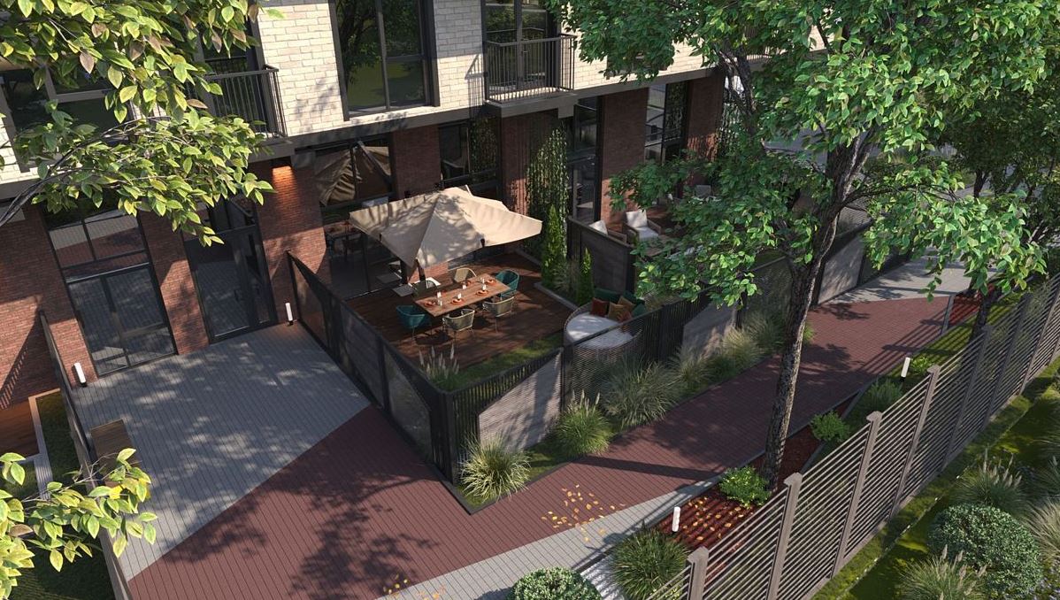 Уютный зеленый двор с зонами отдыха, фонтаном, детской площадкой и зоной барбекю.