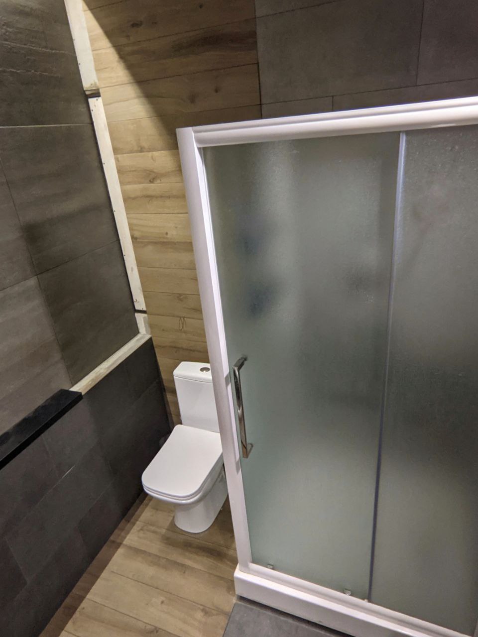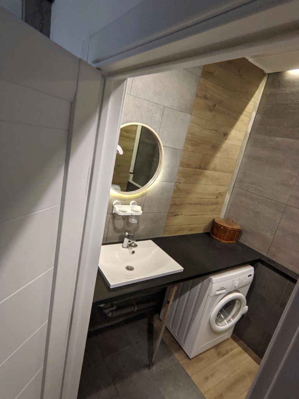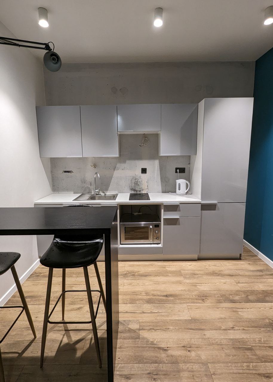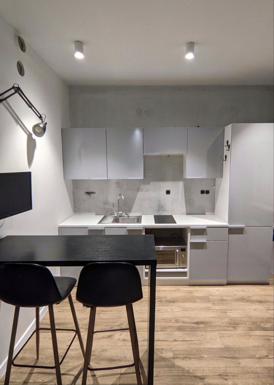 Интерьер выполнен в концепции лакированного бетона — современно, минималистично и эффектно. В квартире установлены кондиционер, стиральная машина, встроенный холодильник. Санузел с душевой кабиной.