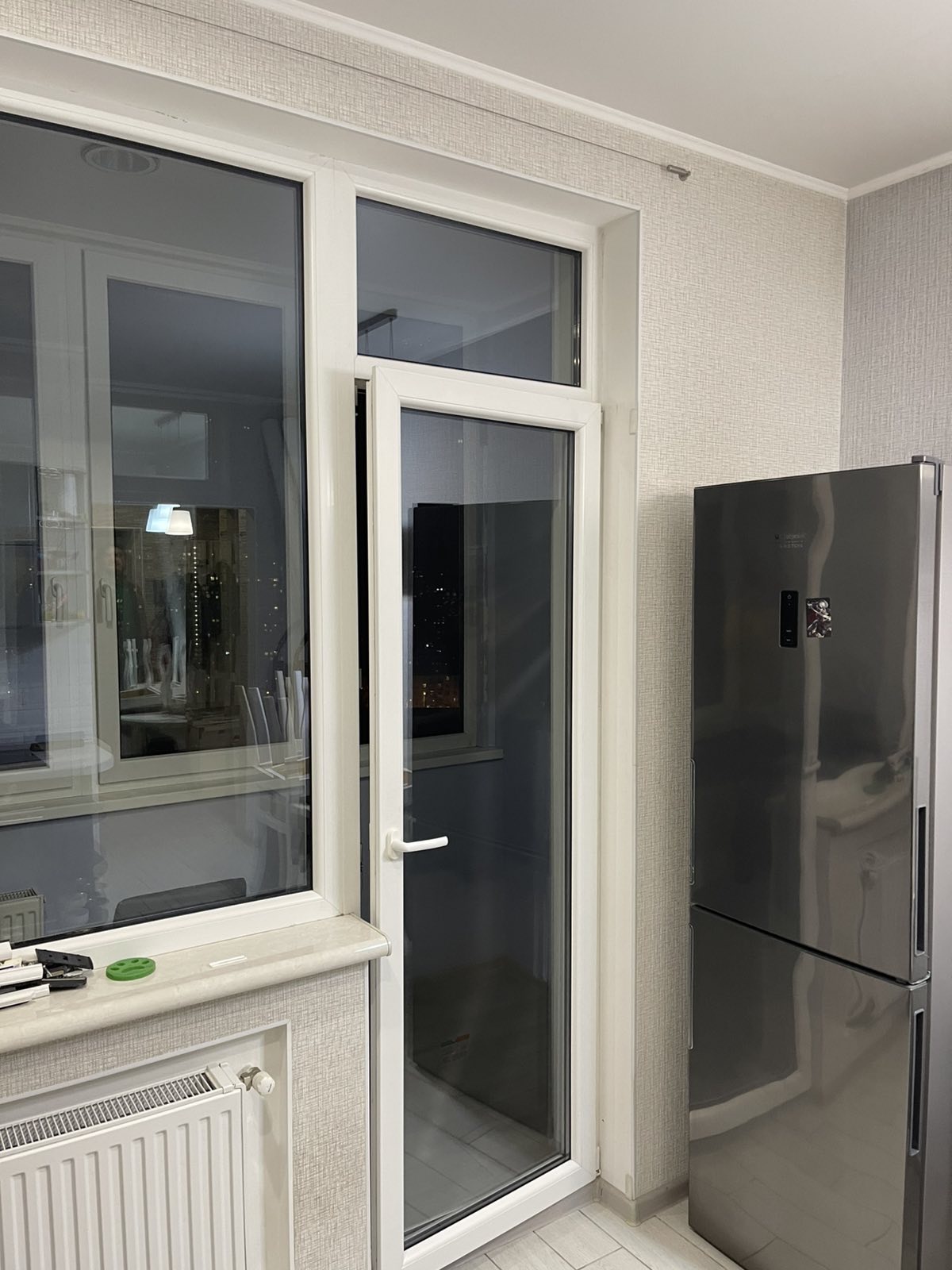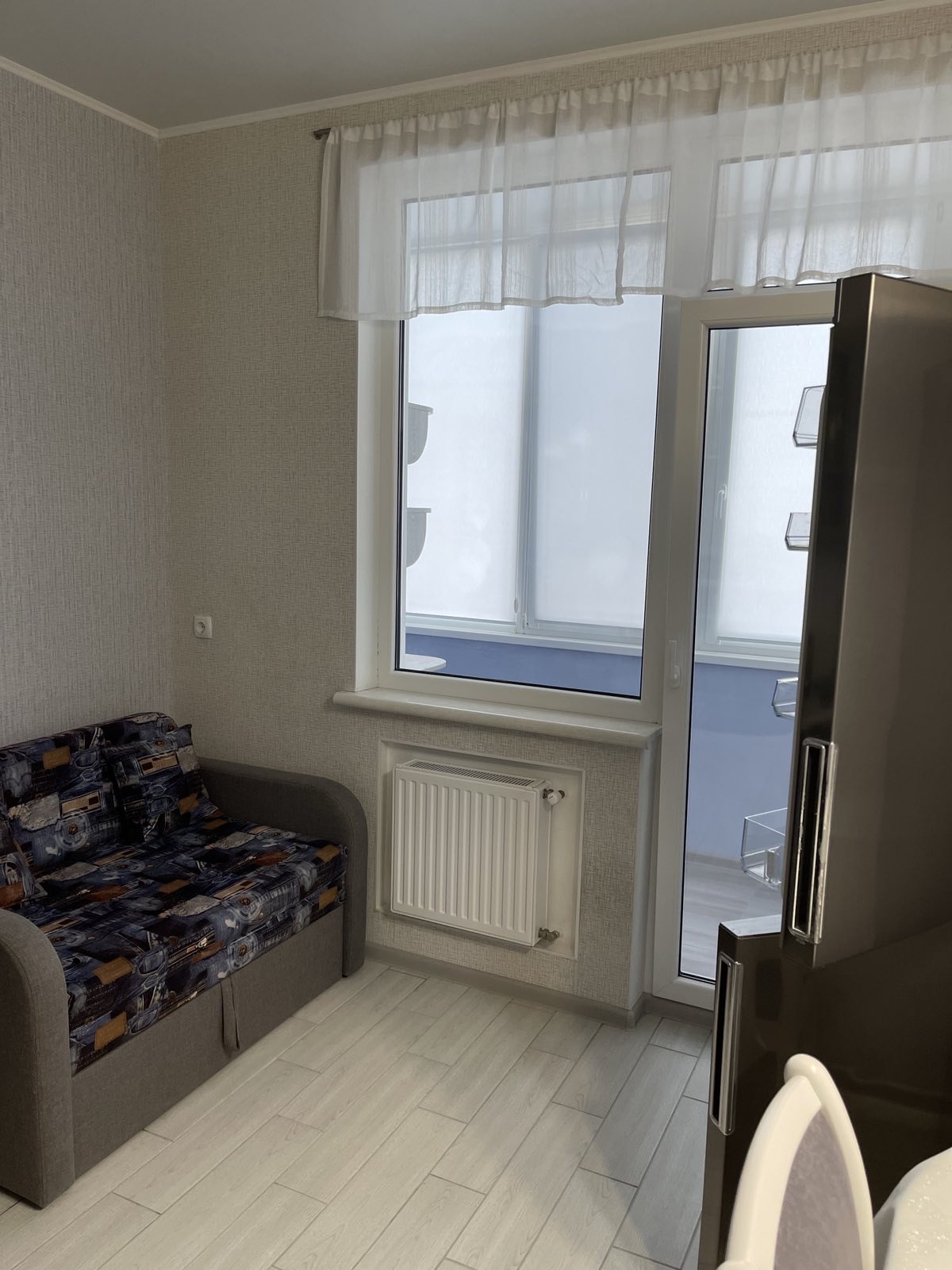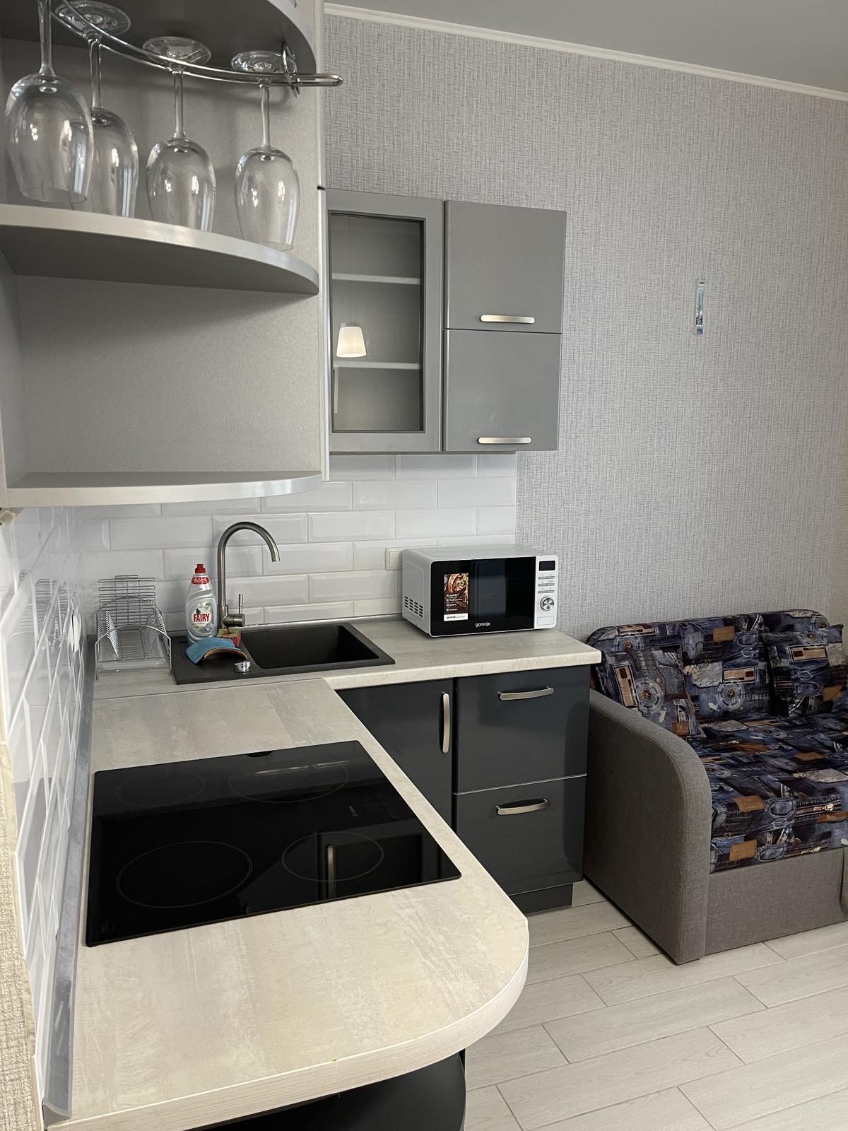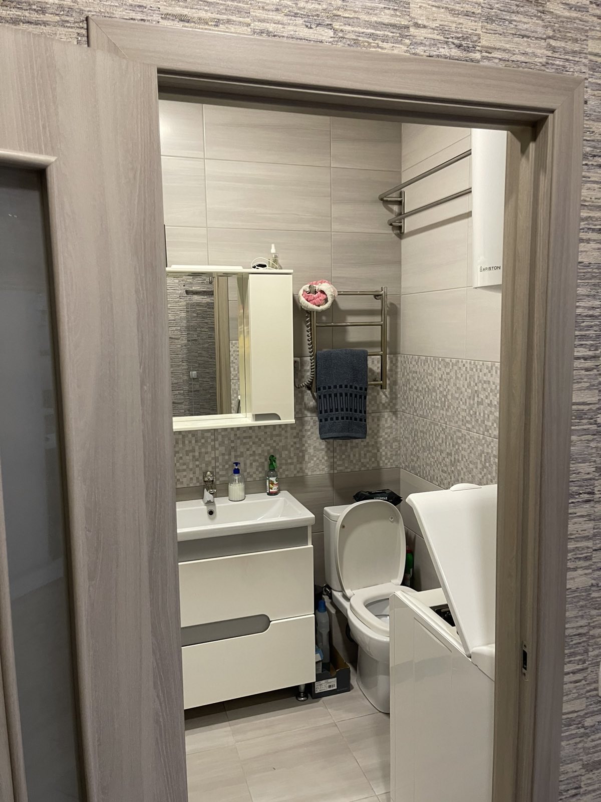 общая площадь 48 м, большая, светлая комната разделена на две зоны, кухня с выходом на балкон, санузел совмещен, современно облицован