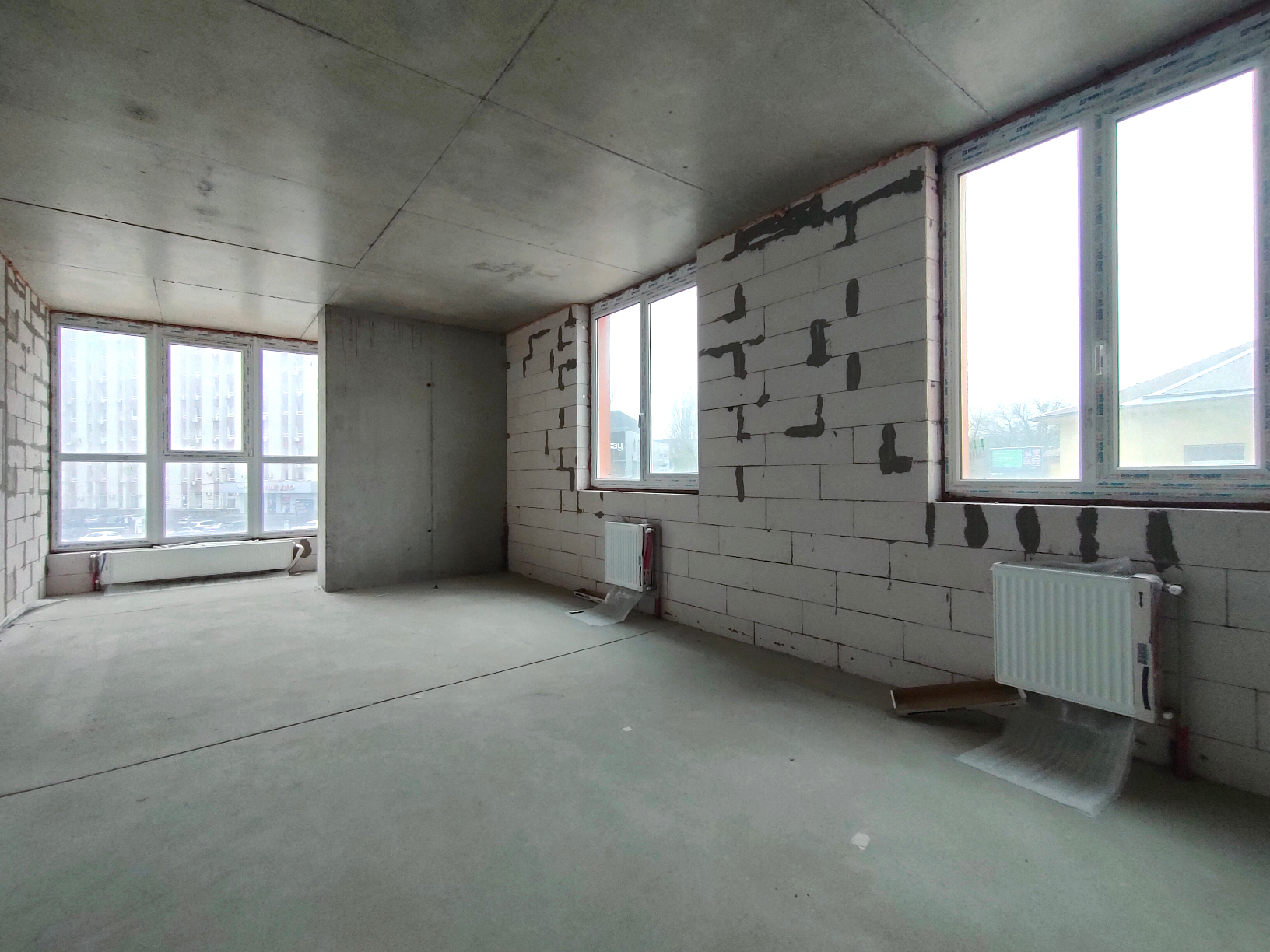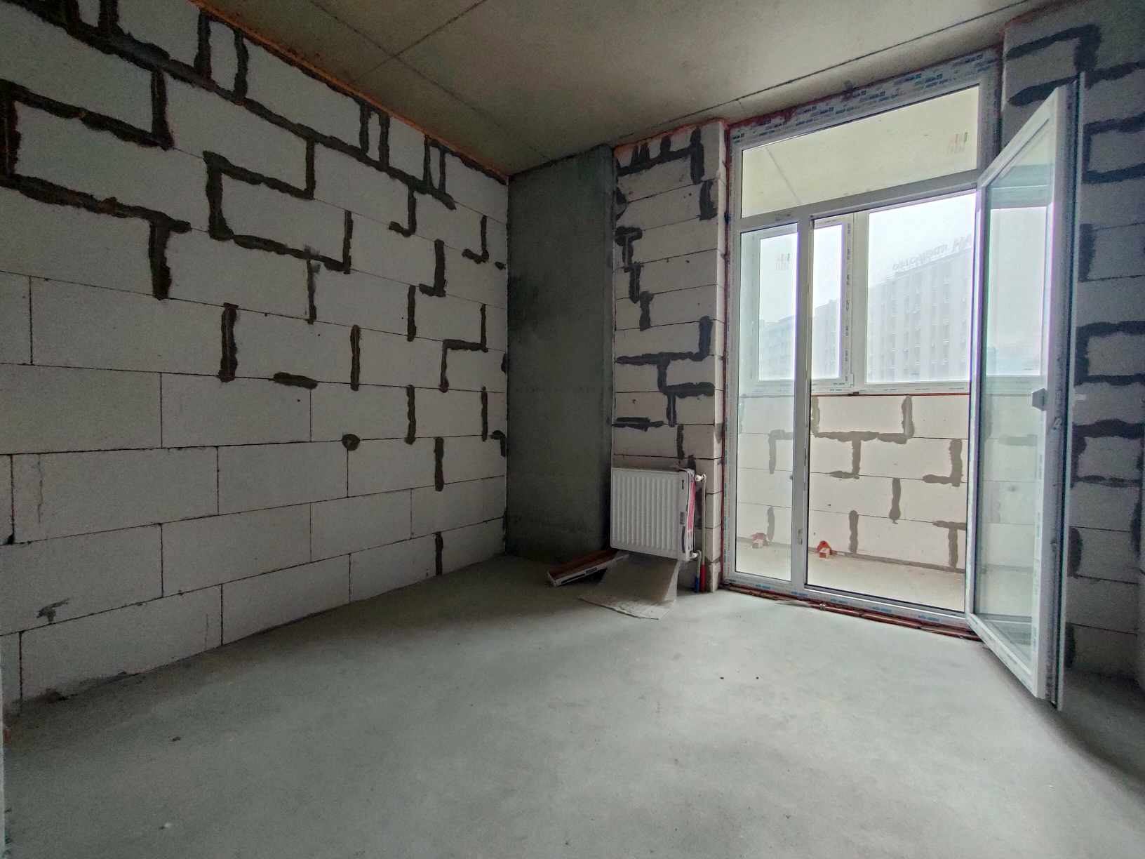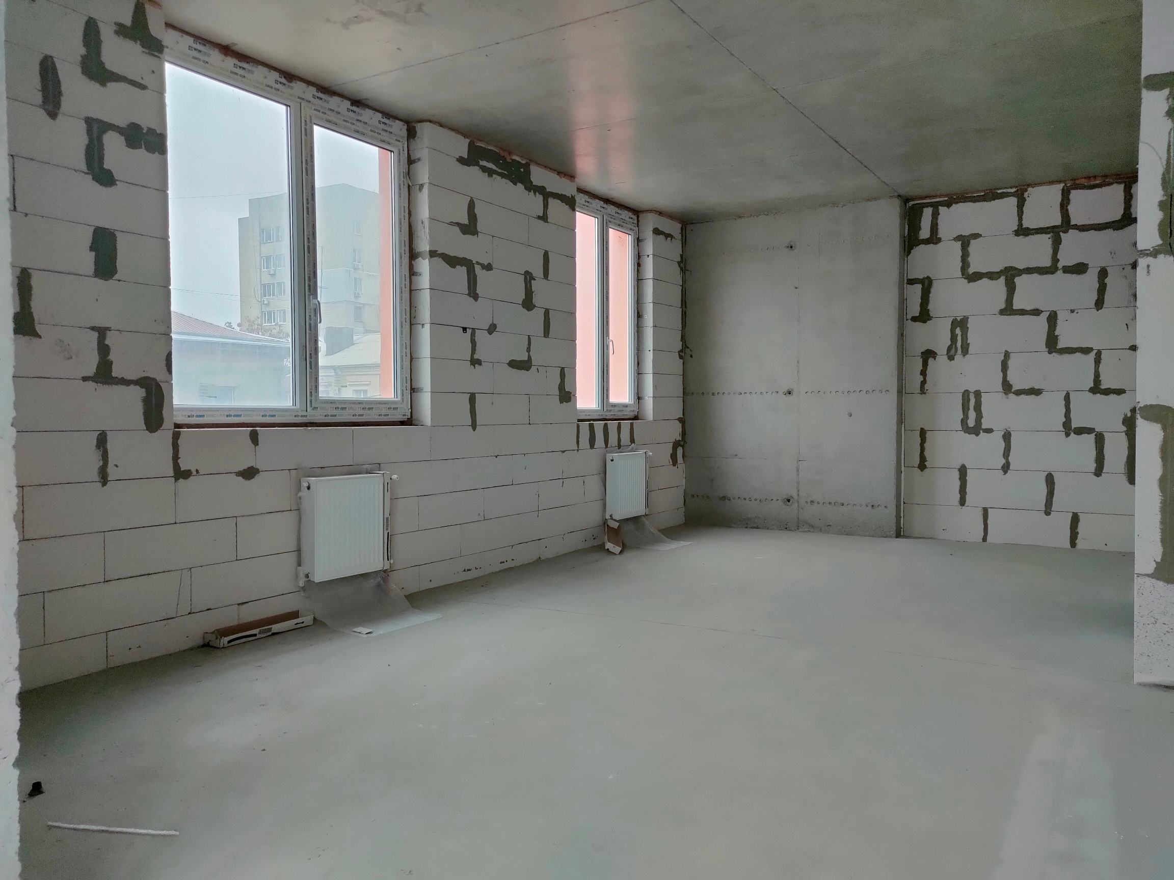 Состояние квартиры от строителей. На полу стяжка, стены не шпаклеваны. Установлены и подключены радиаторы отопления. В квартиру заведена электрика, сантехника, пожарная сигнализация, интернет. Лоджия застеклена. Установлено крепление для наружного блока кондиционера. 3 окна в комнате позволяет поделить на 2 полноценные комнаты.