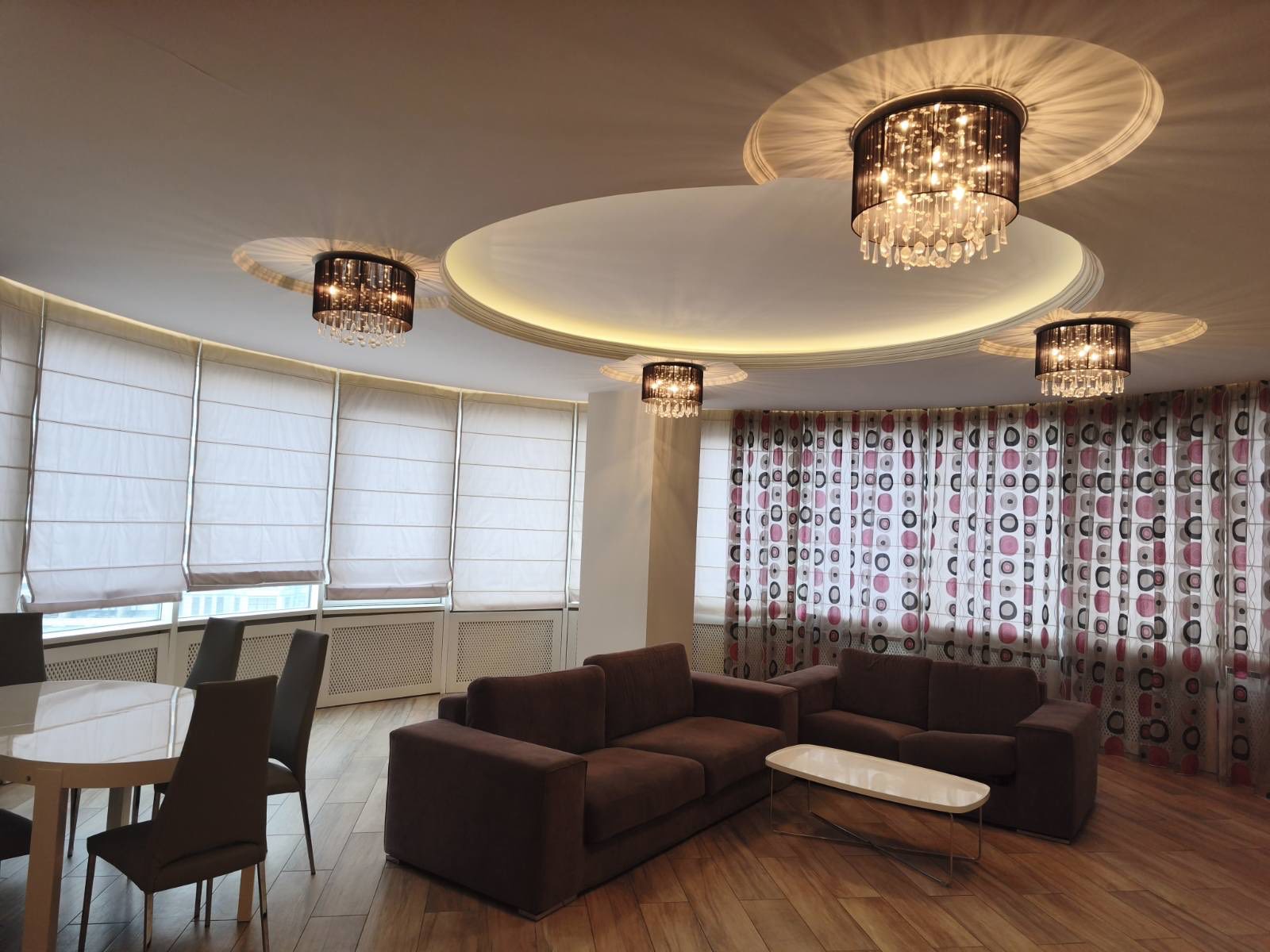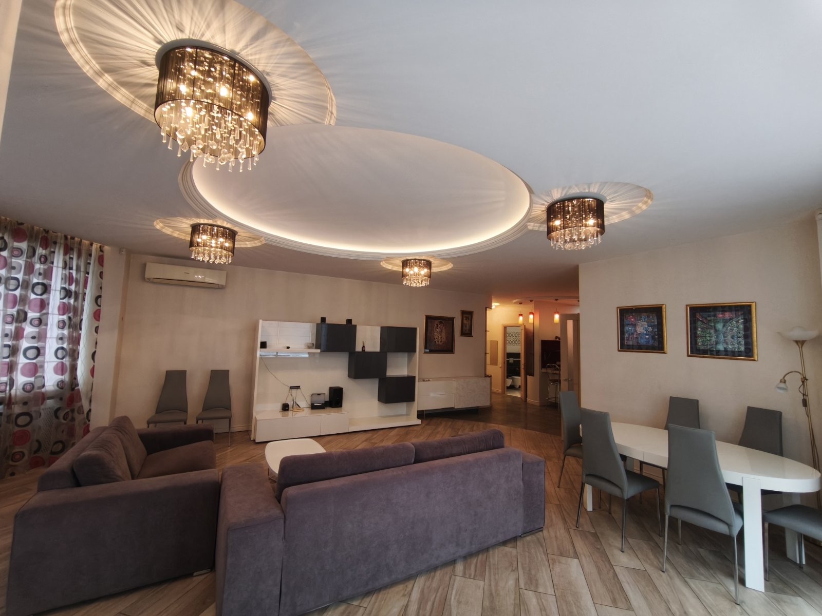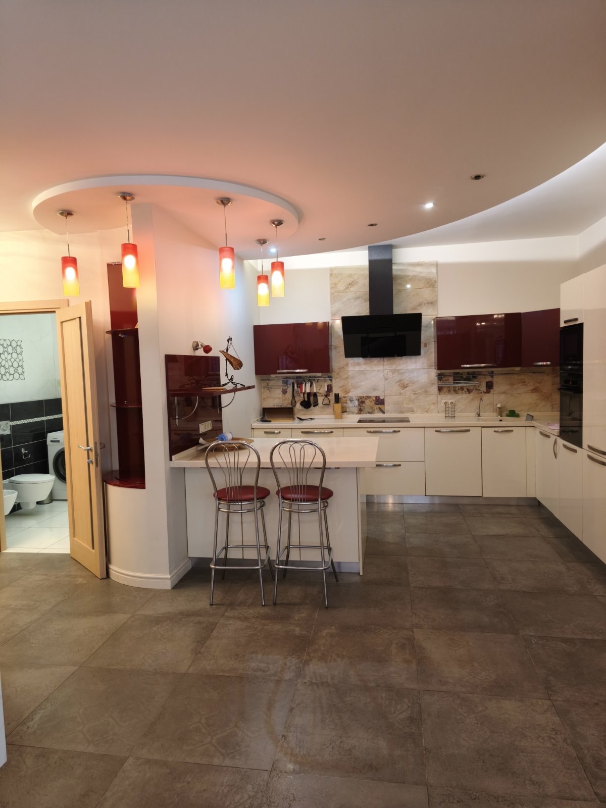 Просторный зал 50 м.кв, кухня 25м.кв, спальня 20м.кв, есть гардеробная комната, т/ванна совм.