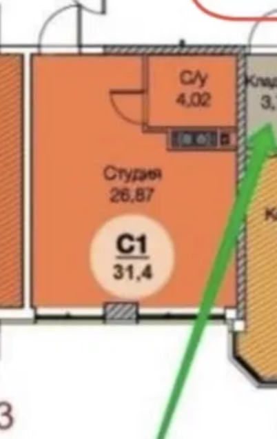 Квартира общей площадью 31.40 кв.м. расположена на 3-ем этаже.